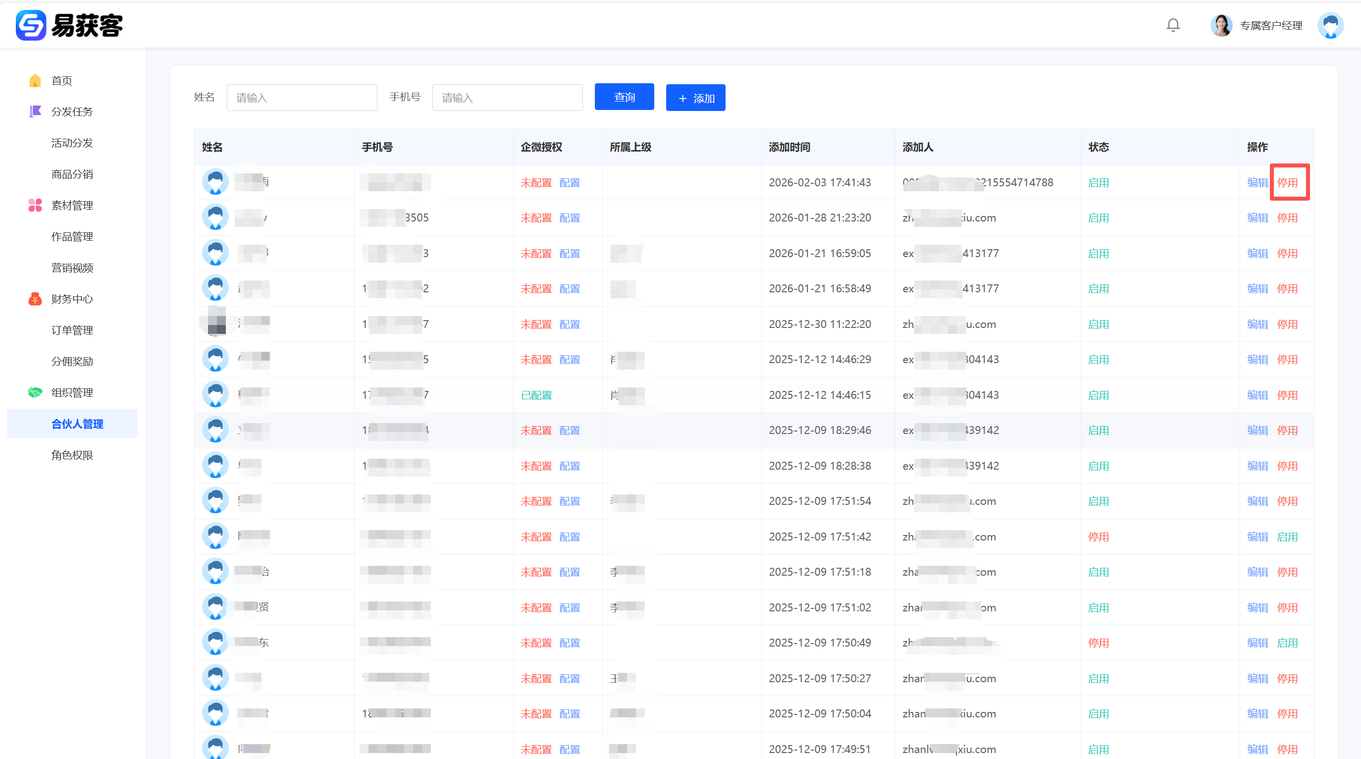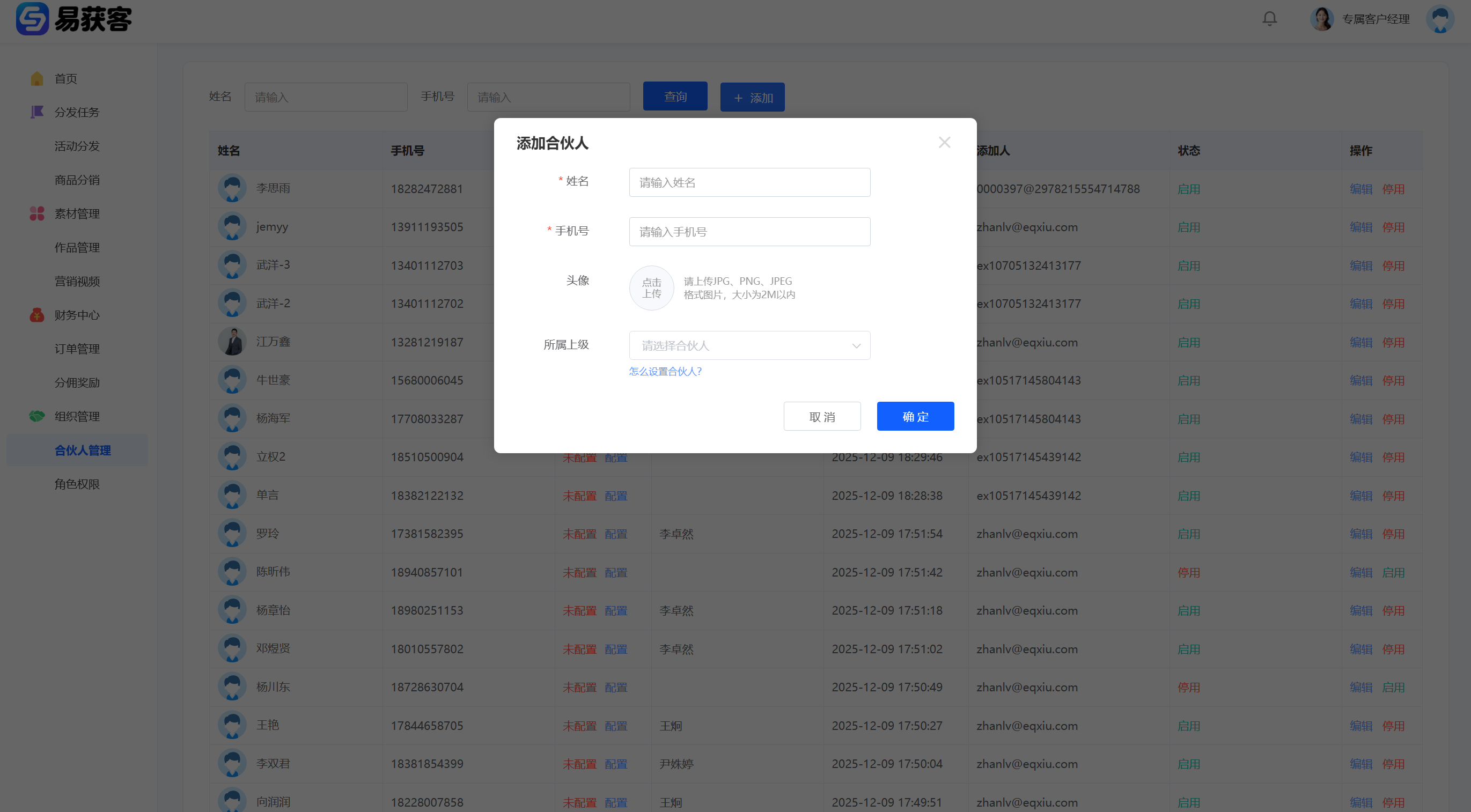 **易获客系统支持设置 一级 / 二级 / 三级合伙人结构,通过“所属上级”字段建立层级关系** **一、添加合伙人** 1、登录易获客管理中心后,在左侧菜单点击【合伙人管理】,进入合伙人管理页面。点击页面右上角【添加】按钮,打开“添加合伙人”弹窗。  2、在弹窗中按要求填写合伙人信息,包括:姓名、联系电话、头像、所属上级;在“所属上级”处选择对应上级合伙人,用于建立分销层级关系。若不选择上级,则默认为一级合伙人;如选择已有上级的合伙人,可形成二级或三级合伙人结构。信息填写完成后,点击【确认】,即可成功添加合伙人  **二、修改合伙人状态** 1、在【合伙人管理】页面,可在对应合伙人信息右侧看到【启用/停用】按钮。点击按钮即可切换合伙人账号状态。当合伙人账号被【停用】后,该合伙人将无法继续领取企业分发的任务。点击【启用】后,合伙人账号恢复正常使用权限。