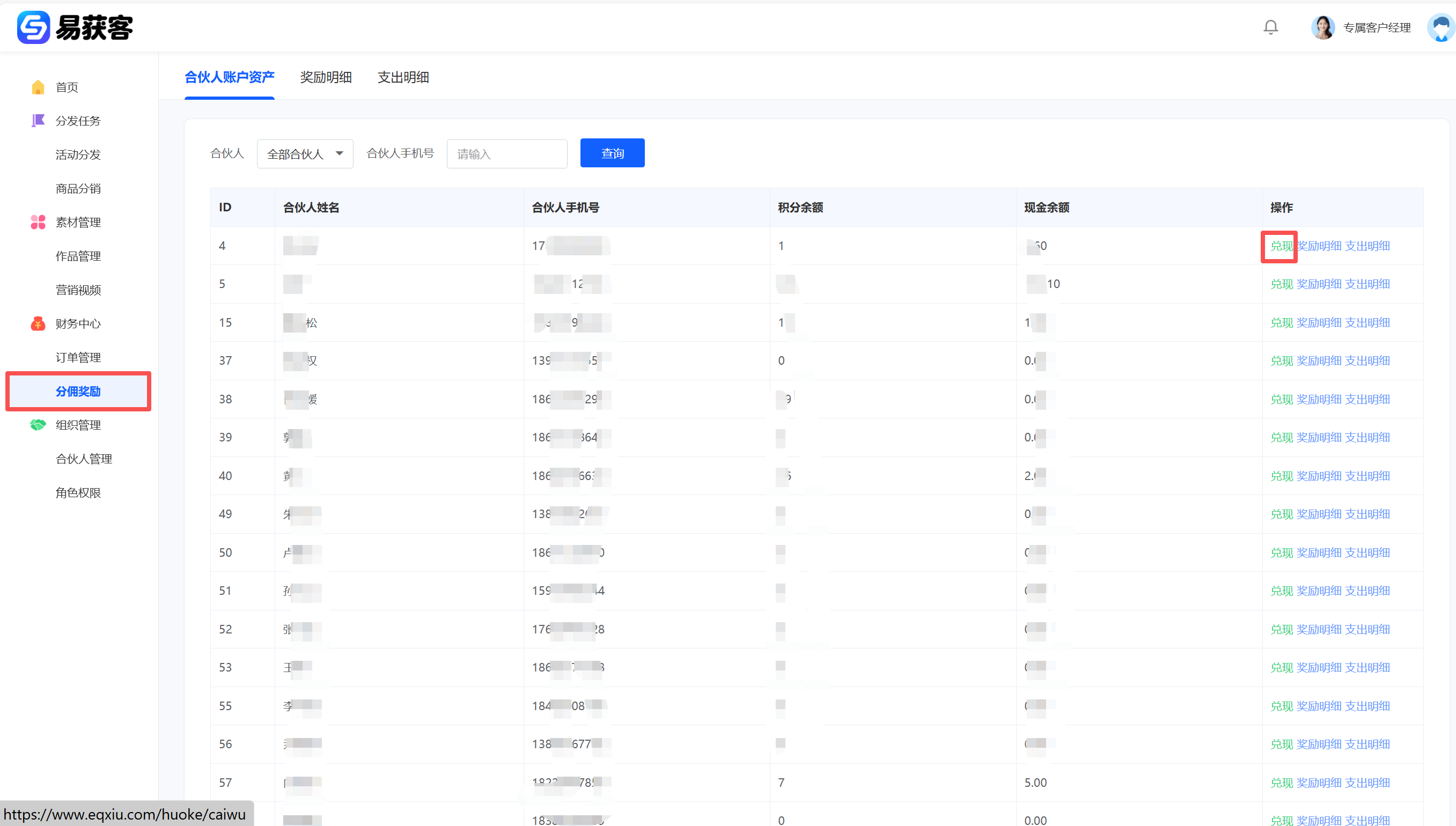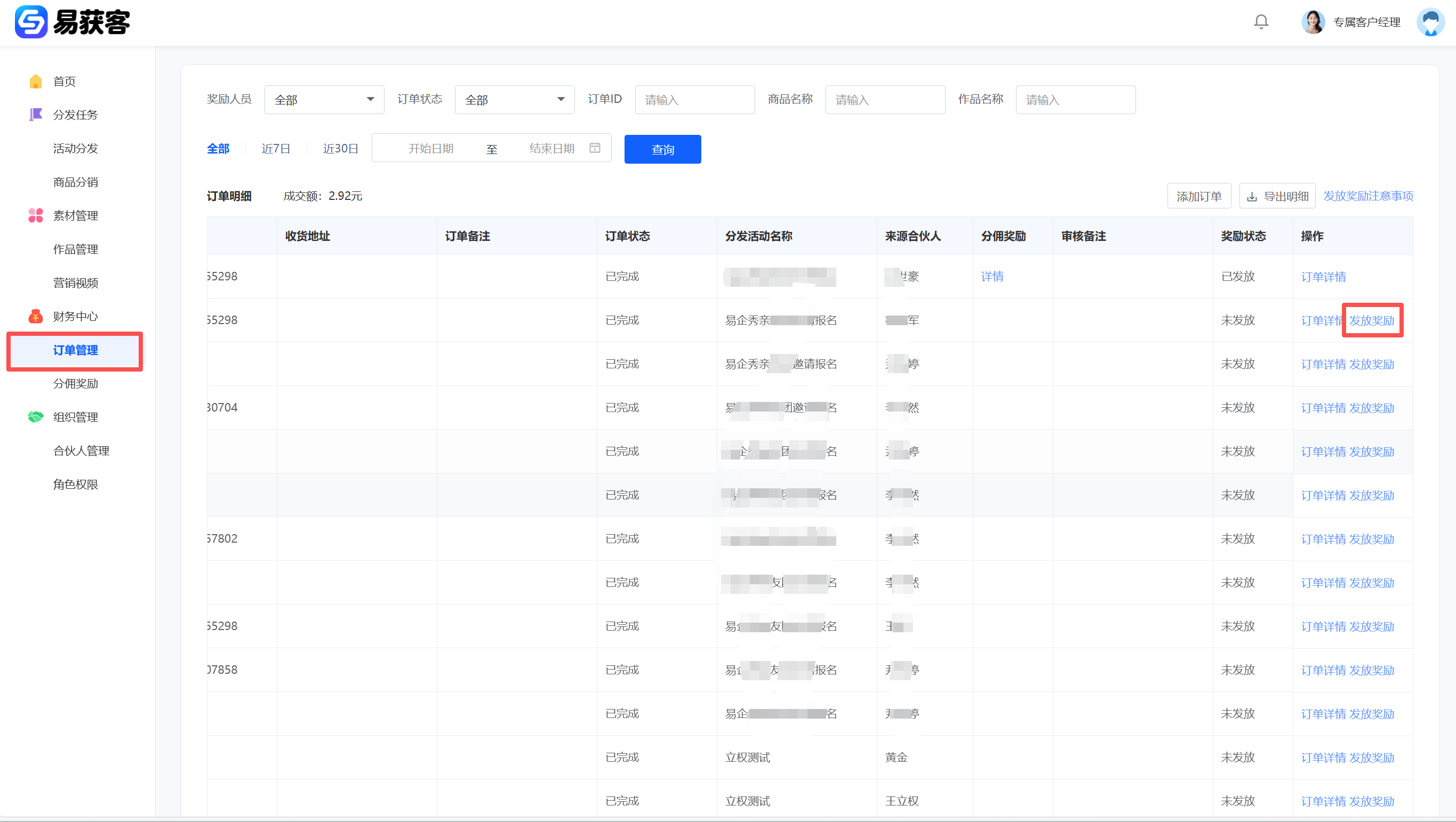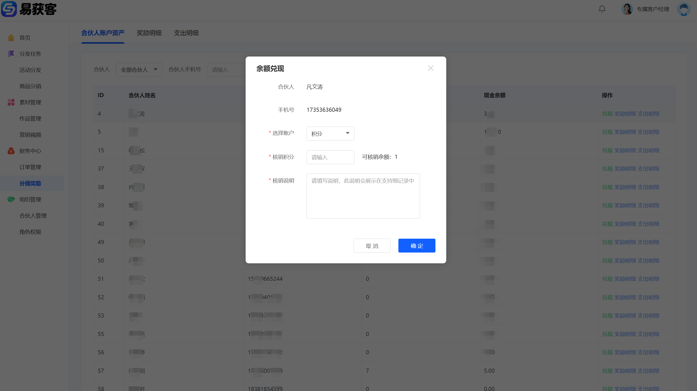 **一、发放激励** 1、当合伙人完成推广并产生有效订单后,管理员需登录易获客管理中心,进入【订单中心】。在订单列表中找到对应订单,确认订单信息及奖励规则无误后,点击【发放激励】按钮。系统发放成功后,对应激励金额将计入合伙人的易获客账户。  2、**手机端发放激励:**打开【易获客】小程序,进入【工作台】。点击【订单管理】,进入订单列表页面。选择对应订单,确认信息无误后进行激励发放操作。(说明:手机端与电脑端发放逻辑一致,均需管理员手动确认后完成发放)  **注意事项:** 1、请在发放前仔细核对订单金额、合伙人身份及激励规则; 2、激励一旦发放成功,系统不可撤回,请谨慎操作。 **二、兑换激励** 1、登录易获客管理中心后,点击【分佣激励】模块,进入激励管理页面  2、在页面中可通过【姓名】或【电话】搜索需要进行兑换的合伙人。找到对应合伙人后,点击【兑换】按钮。在弹出的兑换窗口中填写相关数据(如兑换金额/积分等)。确认信息无误后,点击【确认】,系统将完成本次线上记账。