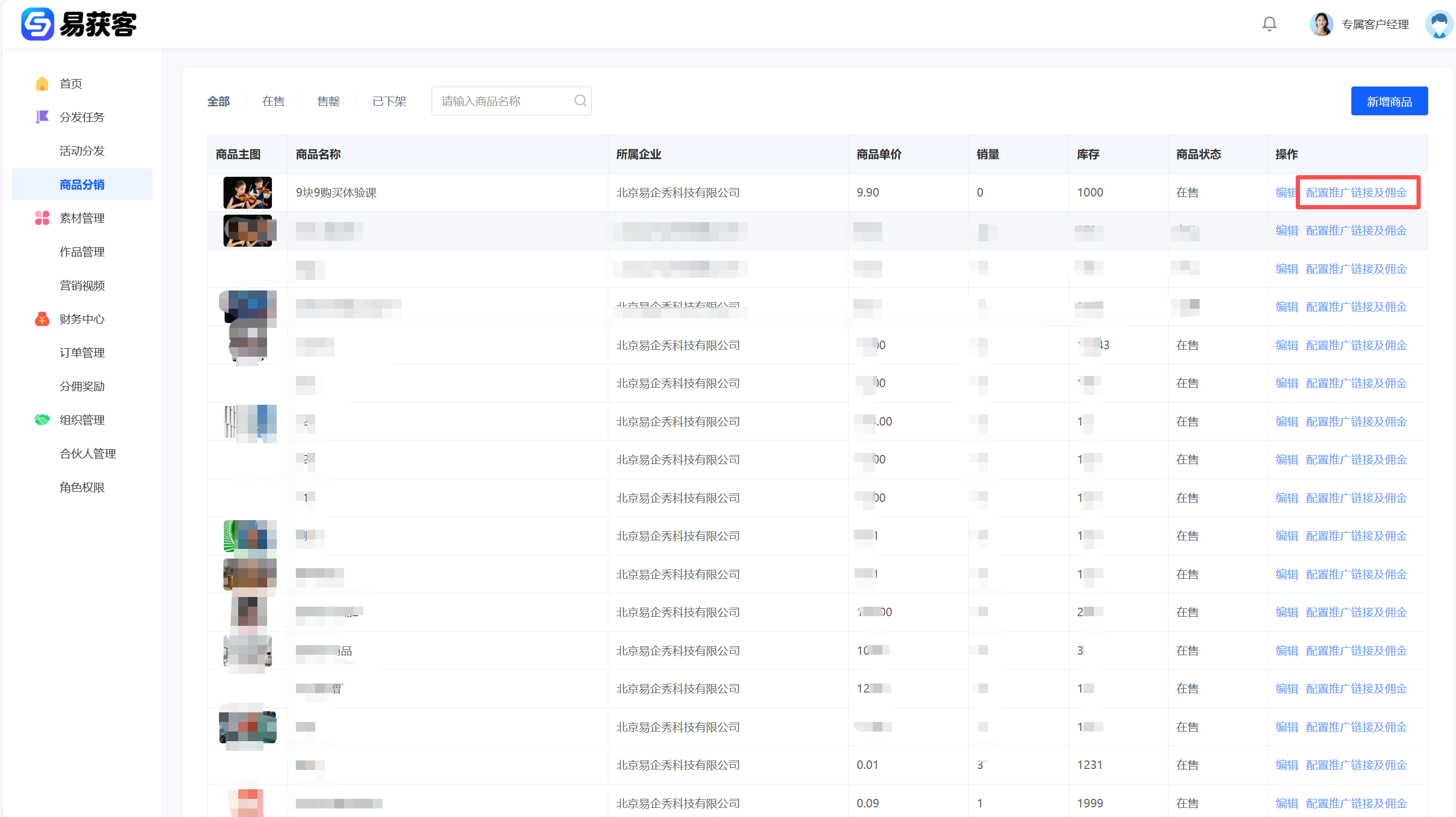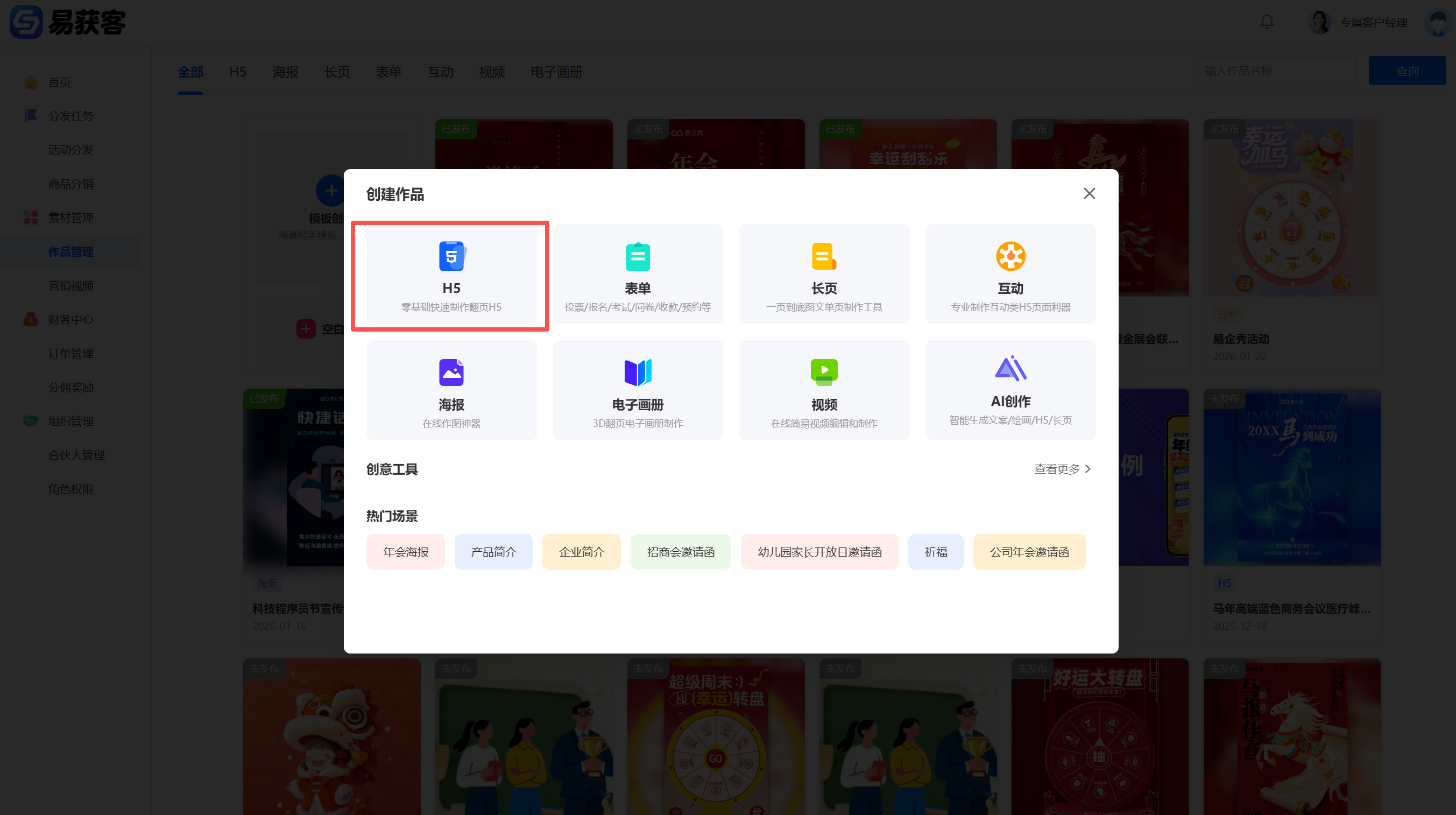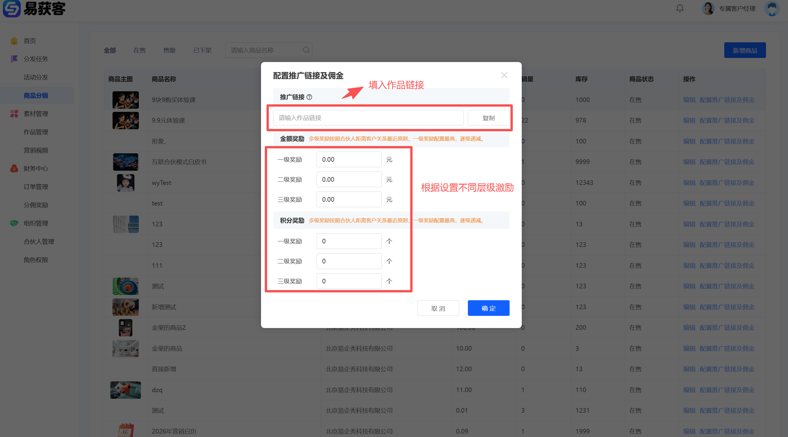1、进入易获客管理中心,点击【作品管理】进入作品列表页。点击【空白创建】→ 选择【H5】开始创建作品。(注:H5 支持【模板创建】或【空白创建】,可按实际需求选择。)   2、进入 H5 编辑页面后,在组件库选择【营销获客】→【电商收款】,并点击【编辑在线收款】  3、点击【添加商品】→ 选择【从商品库中选择商品】  4、在【商品库】中勾选需要绑定的商品(需提前在易获客管理中心创建好)勾选完成后点击【确认】,完成商品添加。  5、商品添加成功后,按页面要求完成【基础设置】及【其他设置】信息填写,确认无误后依次点击【保存】→【发布】。发布成功后点击【复制链接】,完成作品链接复制。   6、返回易获客管理中心,进入【商品分销】,找到对应商品,点击【编辑配置推广链接及佣金】,在弹窗中: -在【推广链接】处粘贴刚才复制的作品链接; -在【激励设置】中,按企业激励规则配置各层级的现金激励/积分激励; -点击【确认】完成配置。   **注:** 企业可将该推广链接配置到营销视频中,方便合伙人进行推广。合伙人也可主动将链接挂载到自己的【营销视频】,用户点击并购买,系统将自动按配置规则计算并发放对应激励。