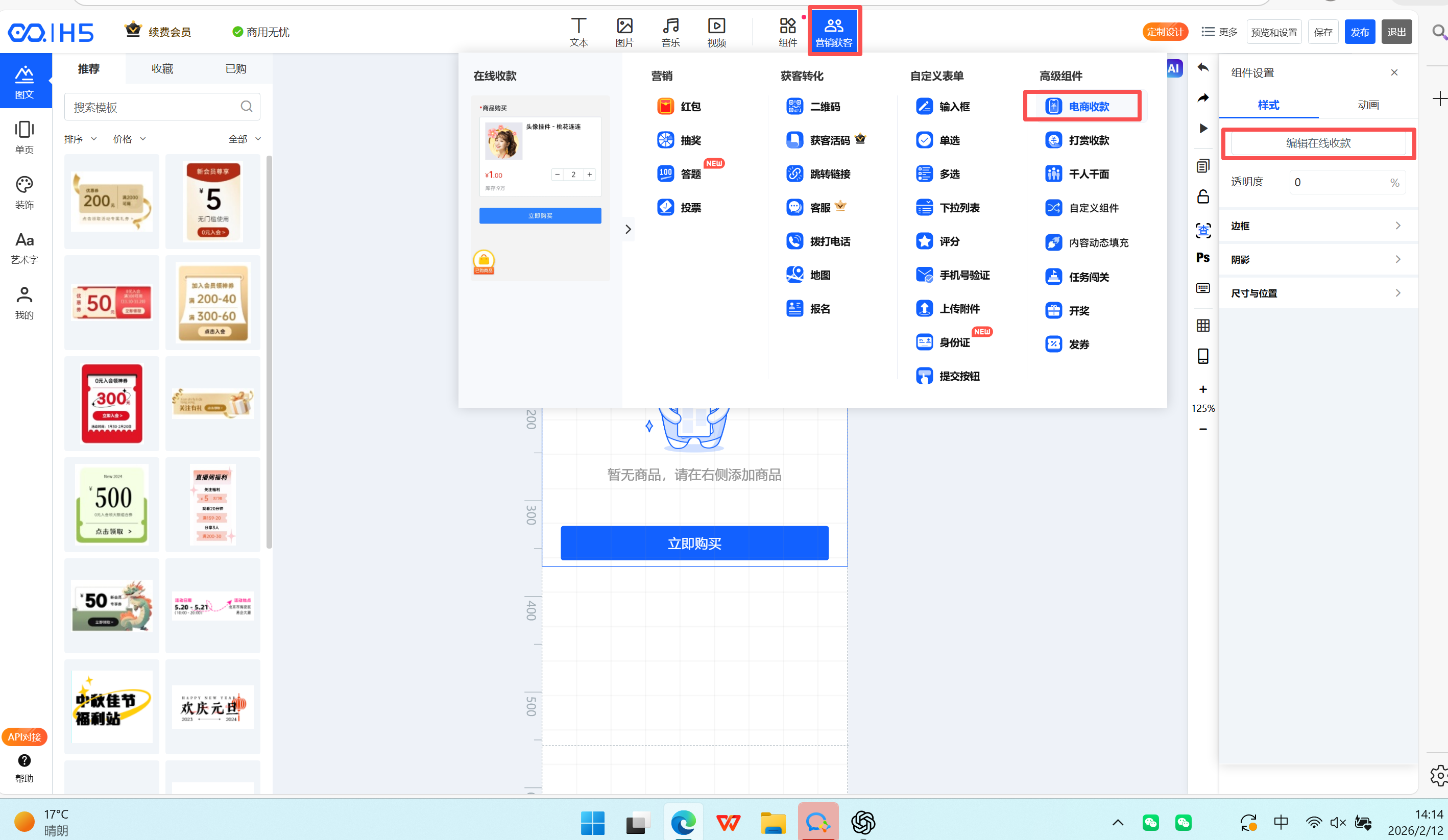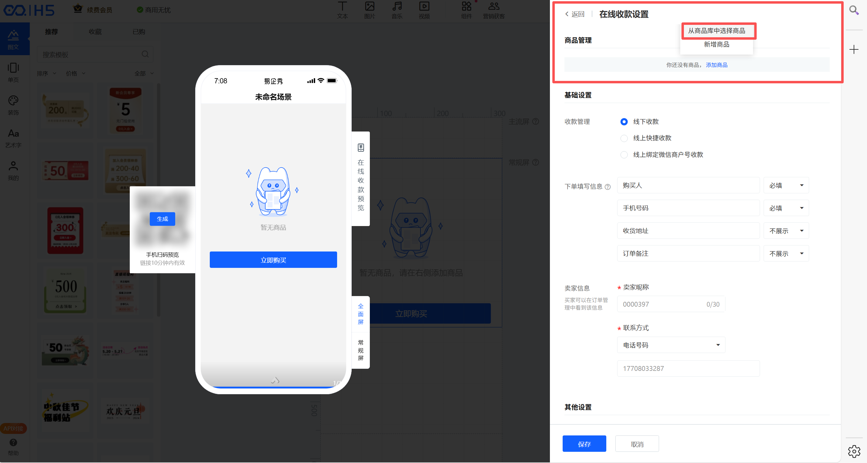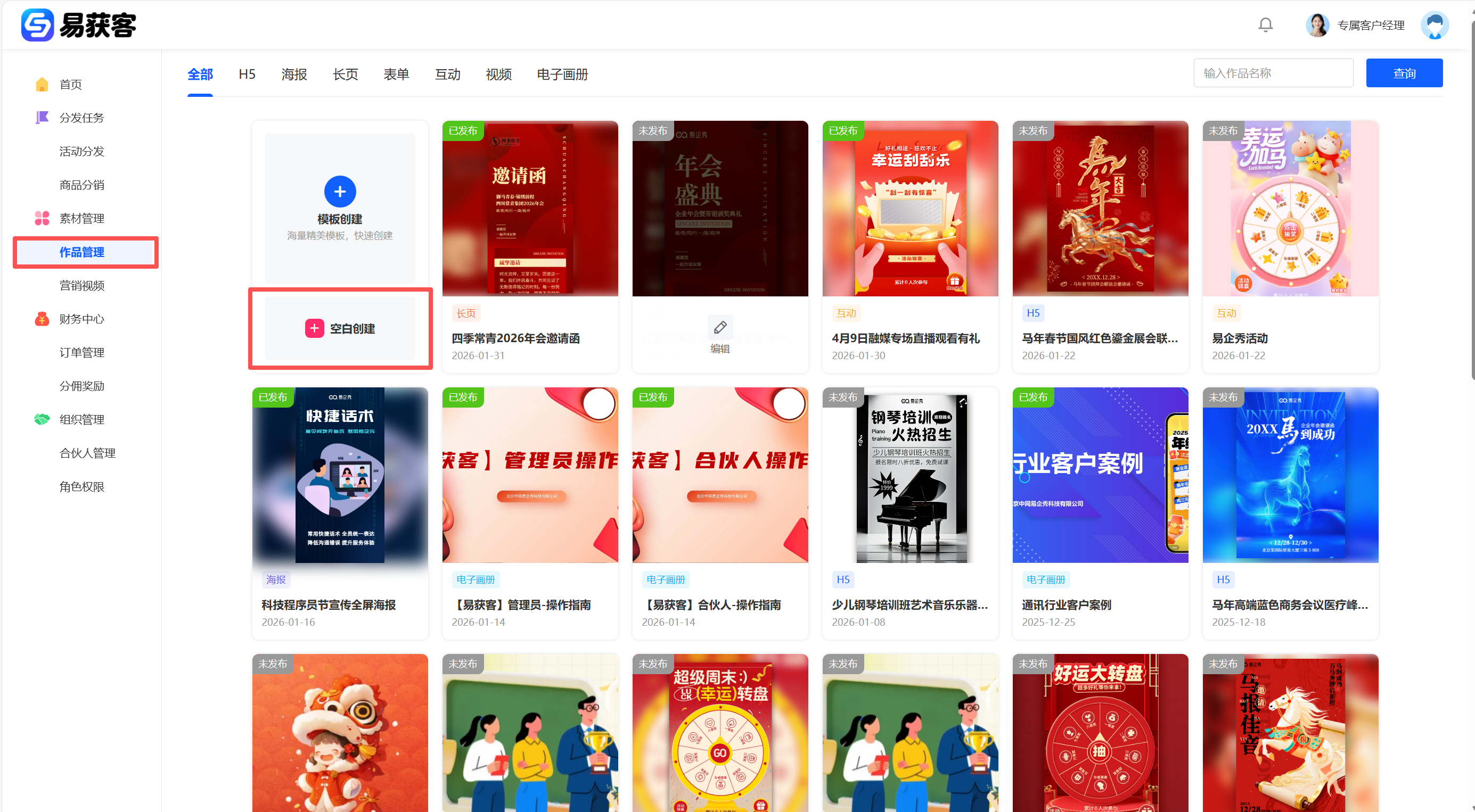 1、进入易获客管理中心,点击【作品管理】进入作品列表页。点击【空白创建】→ 选择【H5】开始创建作品。(注:H5 支持【模板创建】或【空白创建】,可按实际需求选择。)   2、进入 H5 编辑页面后,在组件库选择【营销获客】→【电商收款】,并点击【编辑在线收款】  3、点击【添加商品】→ 选择【从商品库中选择商品】  4、在【商品库】中勾选需要绑定的商品(需提前在易获客管理中心创建好)勾选完成后点击【确认】,完成商品添加。  5、商品添加成功后,按页面要求完成【基础设置】及【其他设置】信息填写,确认无误后依次点击【保存】→【发布】。发布成功后点击【复制链接】,完成作品链接复制。   6、返回易获客管理中心,进入【商品分销】,找到对应商品,点击【编辑配置推广链接及佣金】,在弹窗中: -在【推广链接】处粘贴刚才复制的作品链接; -在【激励设置】中,按企业激励规则配置各层级的现金激励/积分激励; -点击【确认】完成配置。   **注:** 企业可将该推广链接配置到营销视频中,方便合伙人进行推广。合伙人也可主动将链接挂载到自己的【营销视频】,用户点击并购买,系统将自动按配置规则计算并发放对应激励。