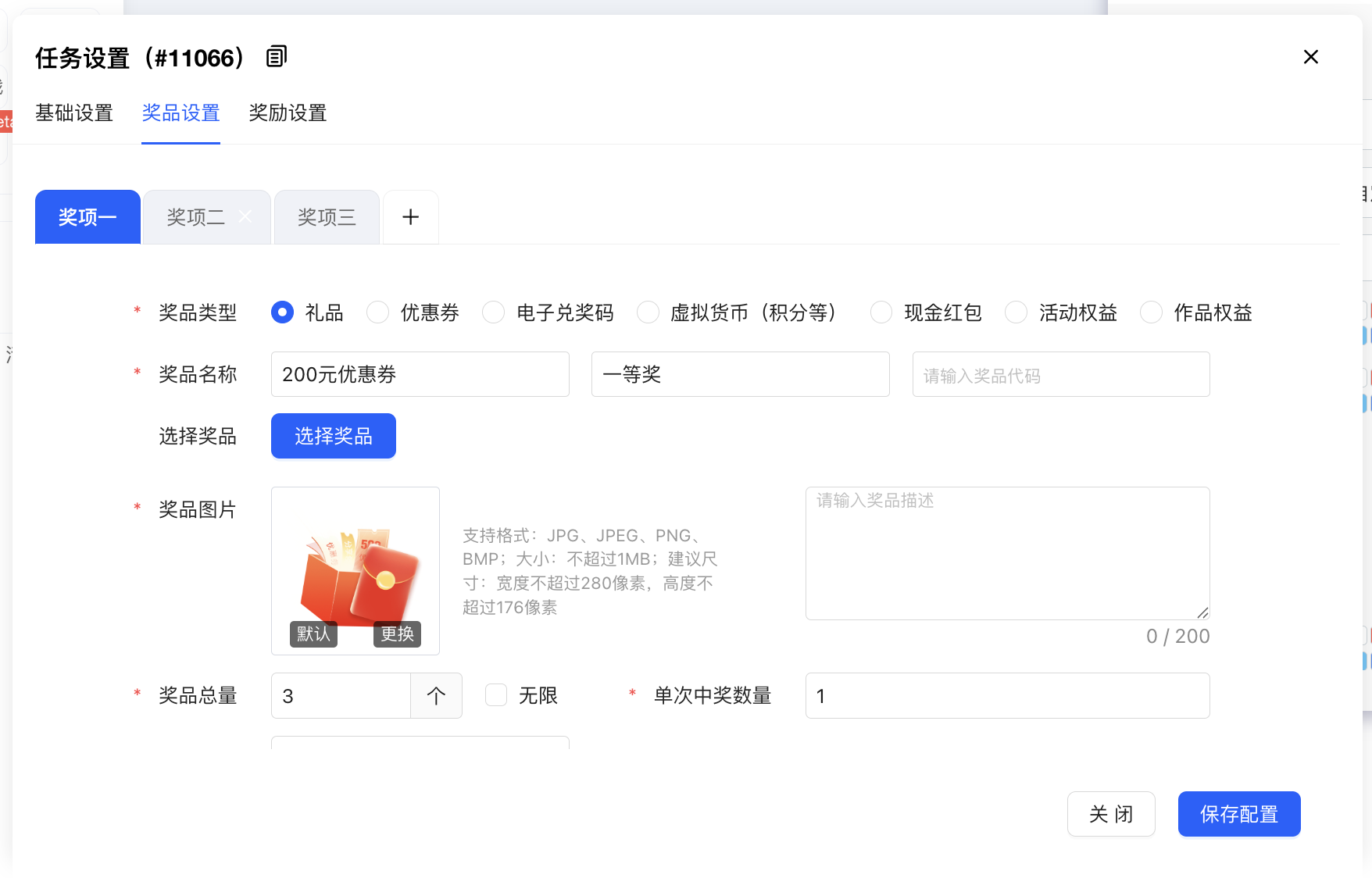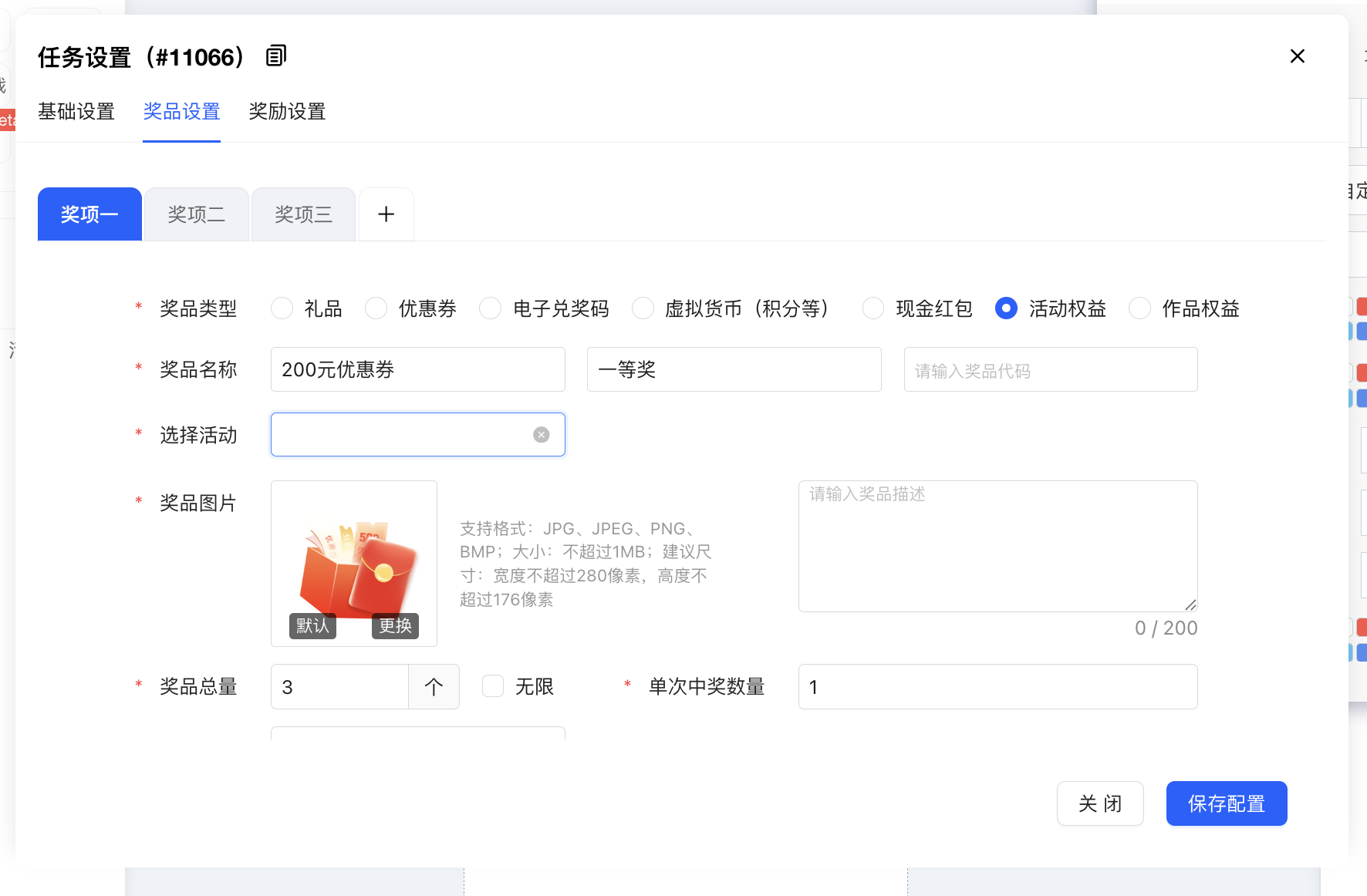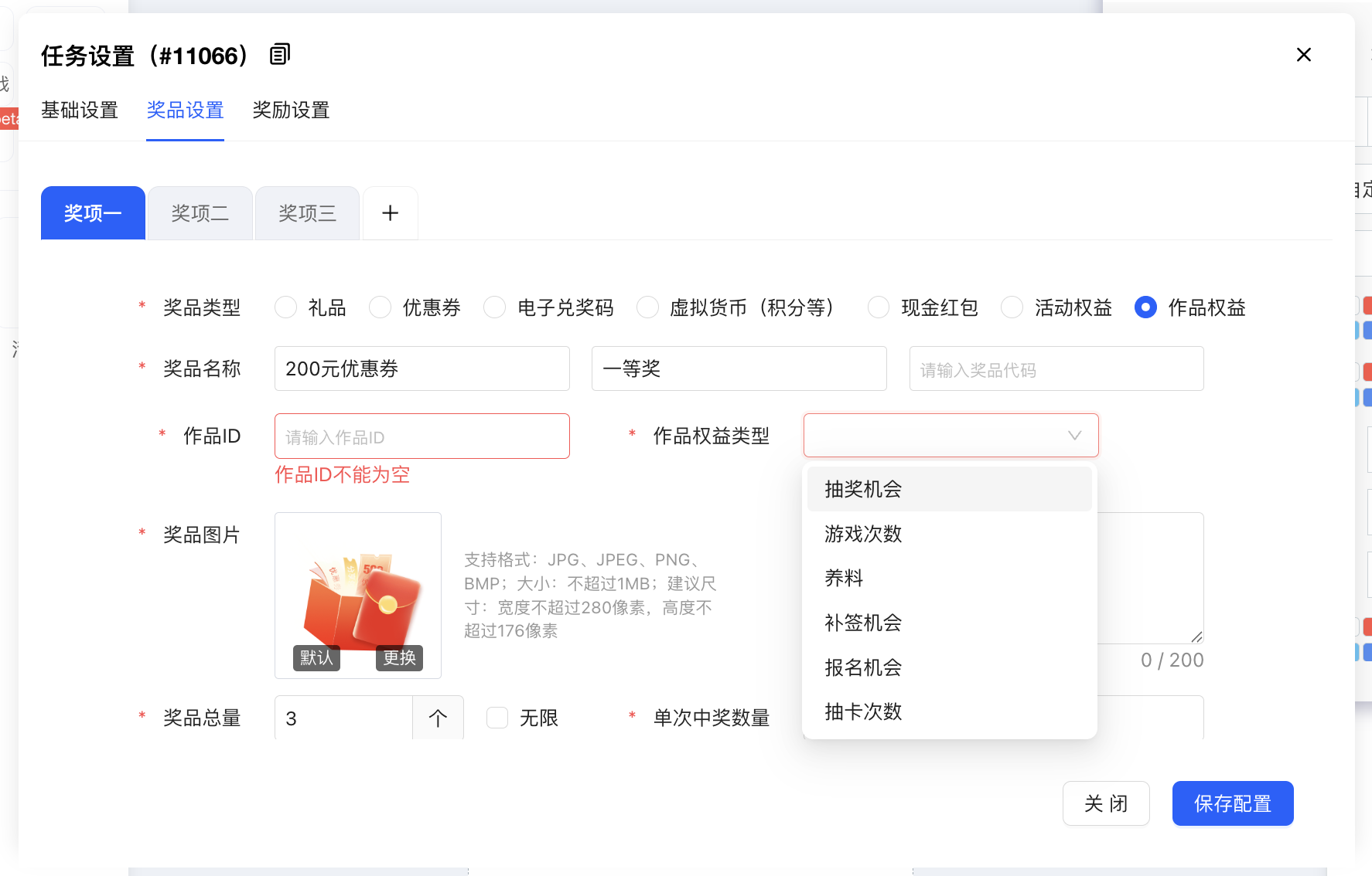 奖品设置:可以选择完成这个任务获得的奖品进行配置,支持礼品、活动权益和作品权益