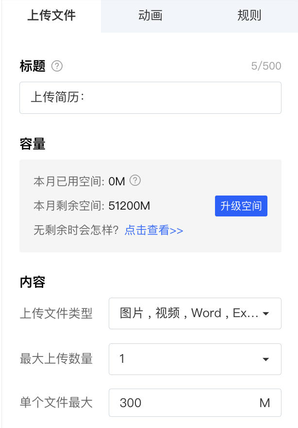 并在编辑器右侧设置上传文件的类型:图片/视频/Word/Excel/PPT/PDF,及可上传的文件数量,并且设置单个文件大小限制,即可实现让用户通过您的表单上传文件啦;