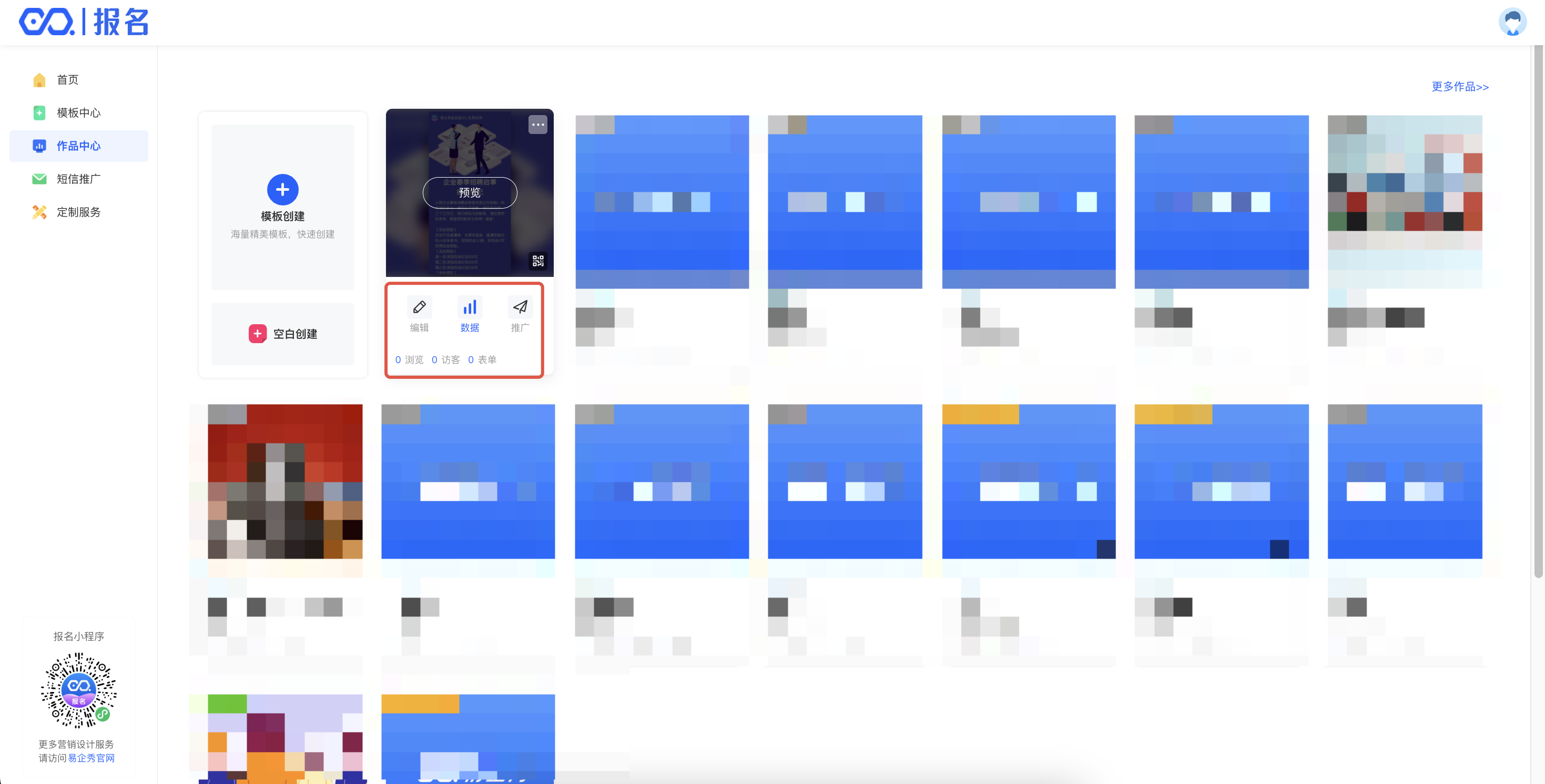 进入【作品中心】,可看到自己的作品,在作品下方即会展示出作品当前的“浏览量”、“访客量”和“表单量”。