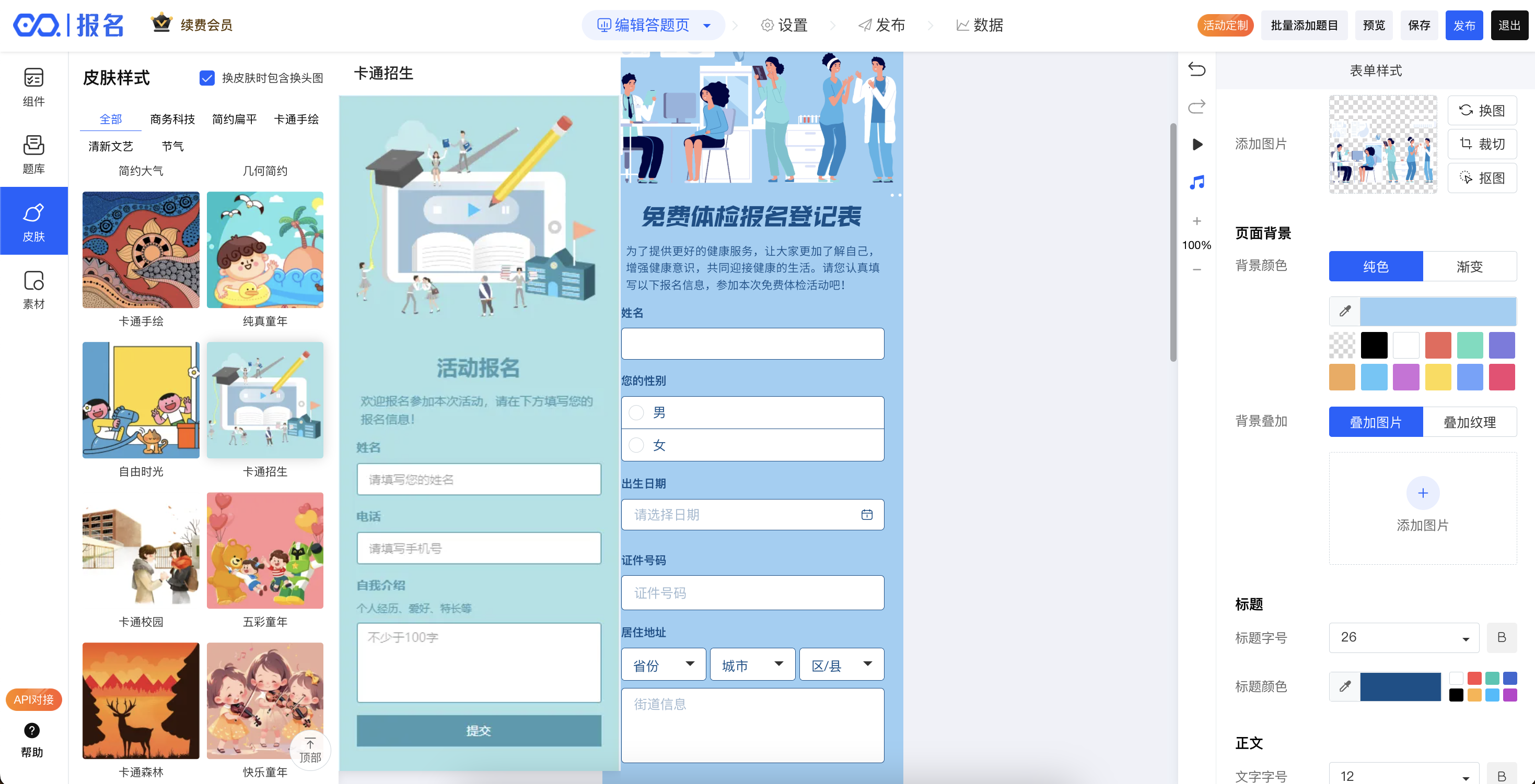 挑选一个风格合适的皮肤,可以让作品看起来非常精美,易企秀报名,提供了丰富的皮肤样式,完全免费使用;
