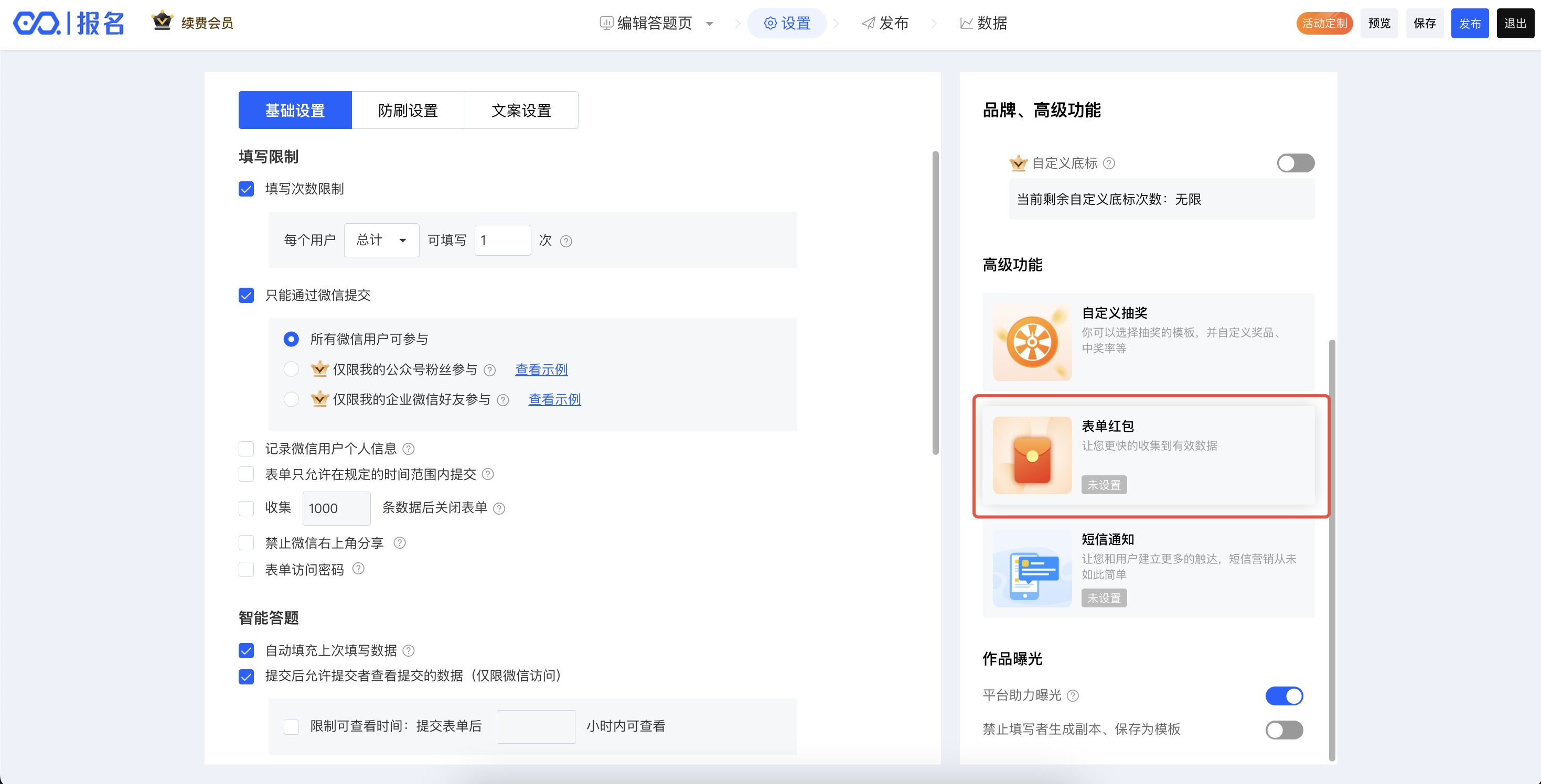进入编辑器--设置--高级功能,选择“表单红包”,即可进行红包设置。