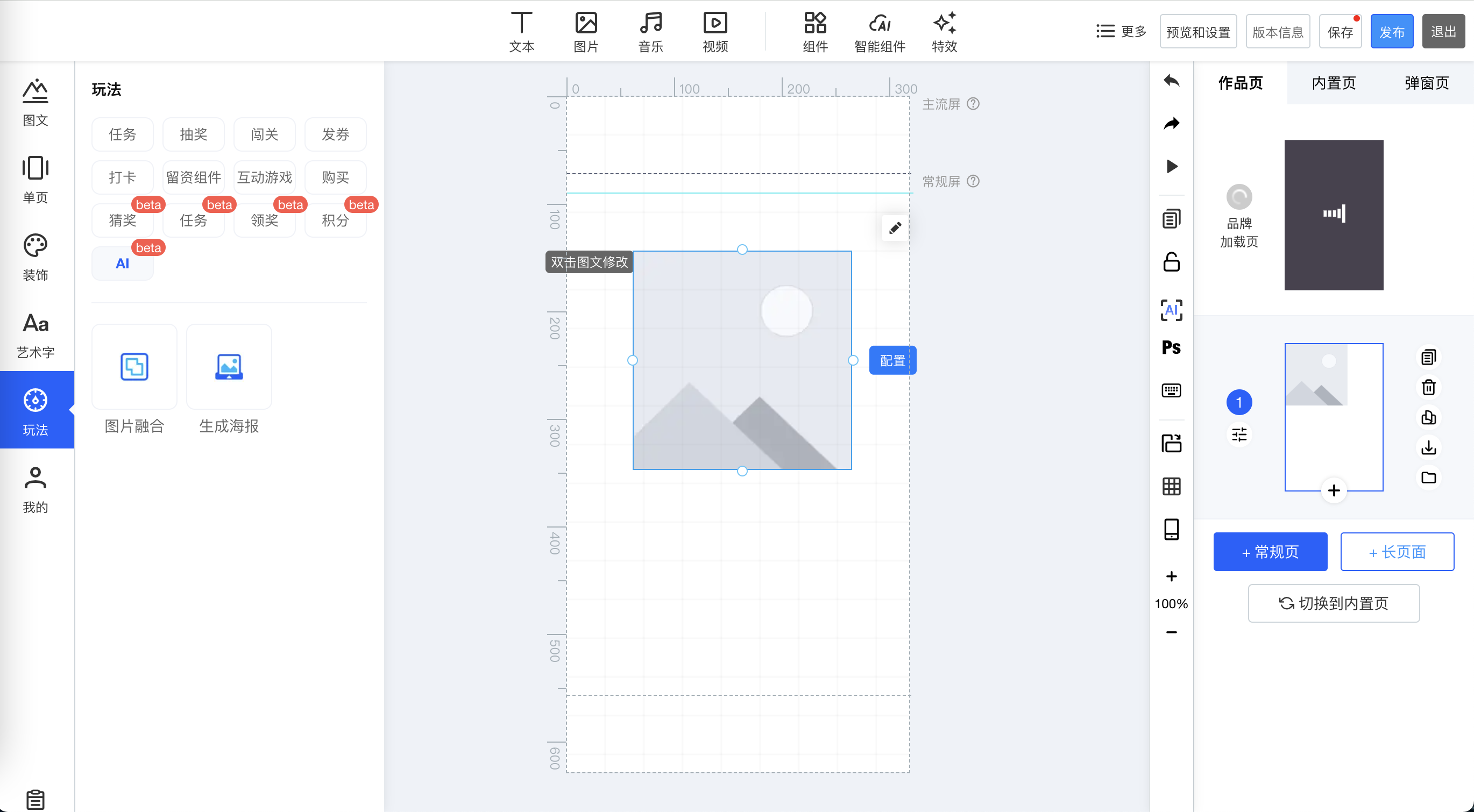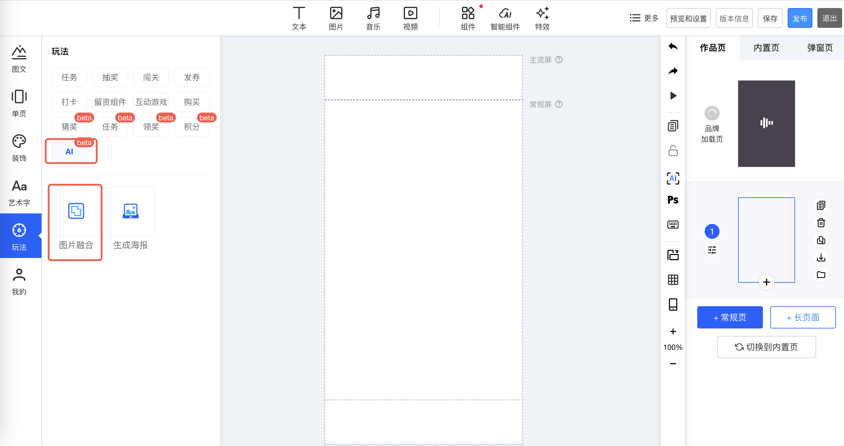 ①空白创建H5作品(略)→②进入H5编辑器,点击玩法选择AI→③编辑AI玩法-图片融合组件→④作品发布