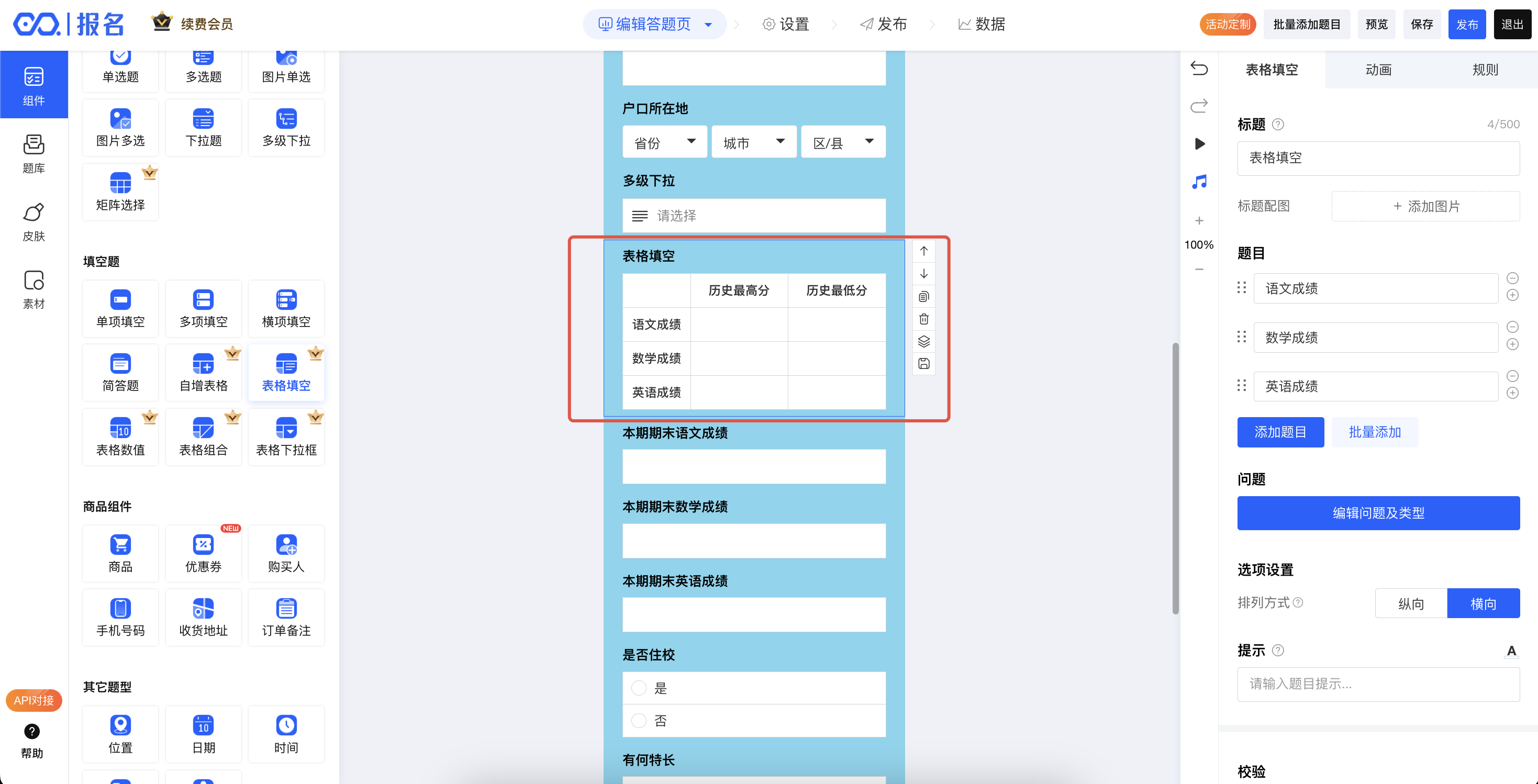 使用【表格填空】组件,可以让制作者像建立表格一样,设置多个行/列,来让用户填写内容。