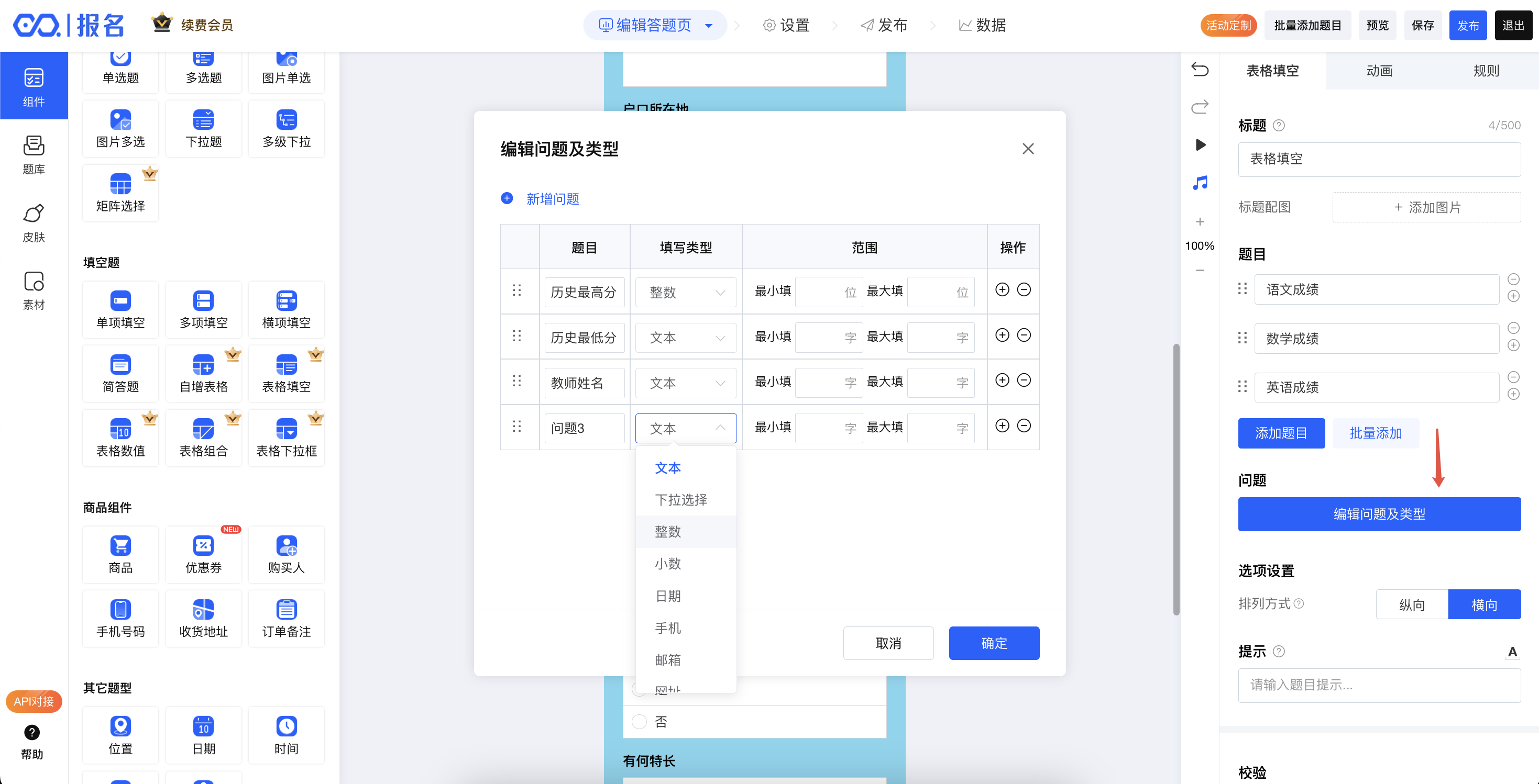 当我们需要对不同的对象,设置多个相同的问题,就可以使用表格填空,比如: