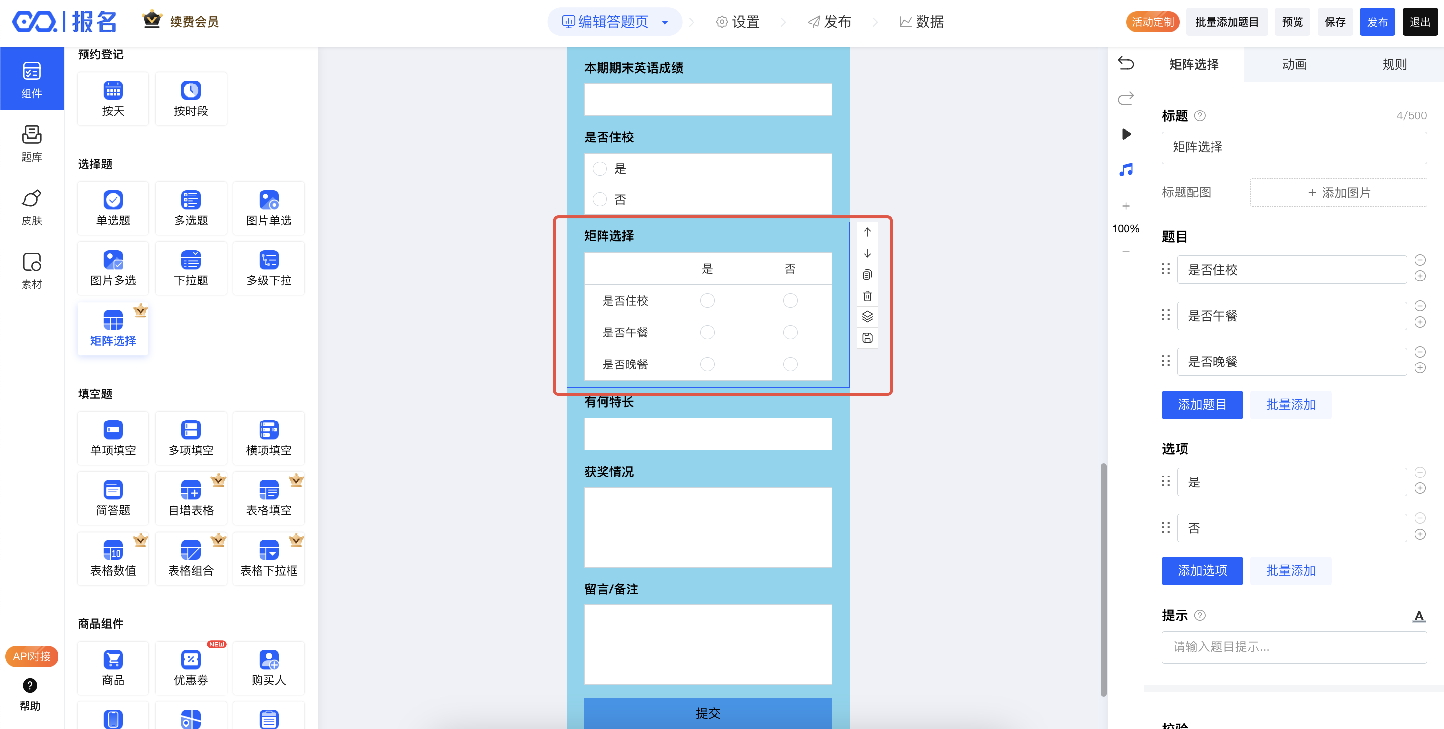进入表单编辑器--组件--选择题--矩阵选择,点击即可添加到作品中。