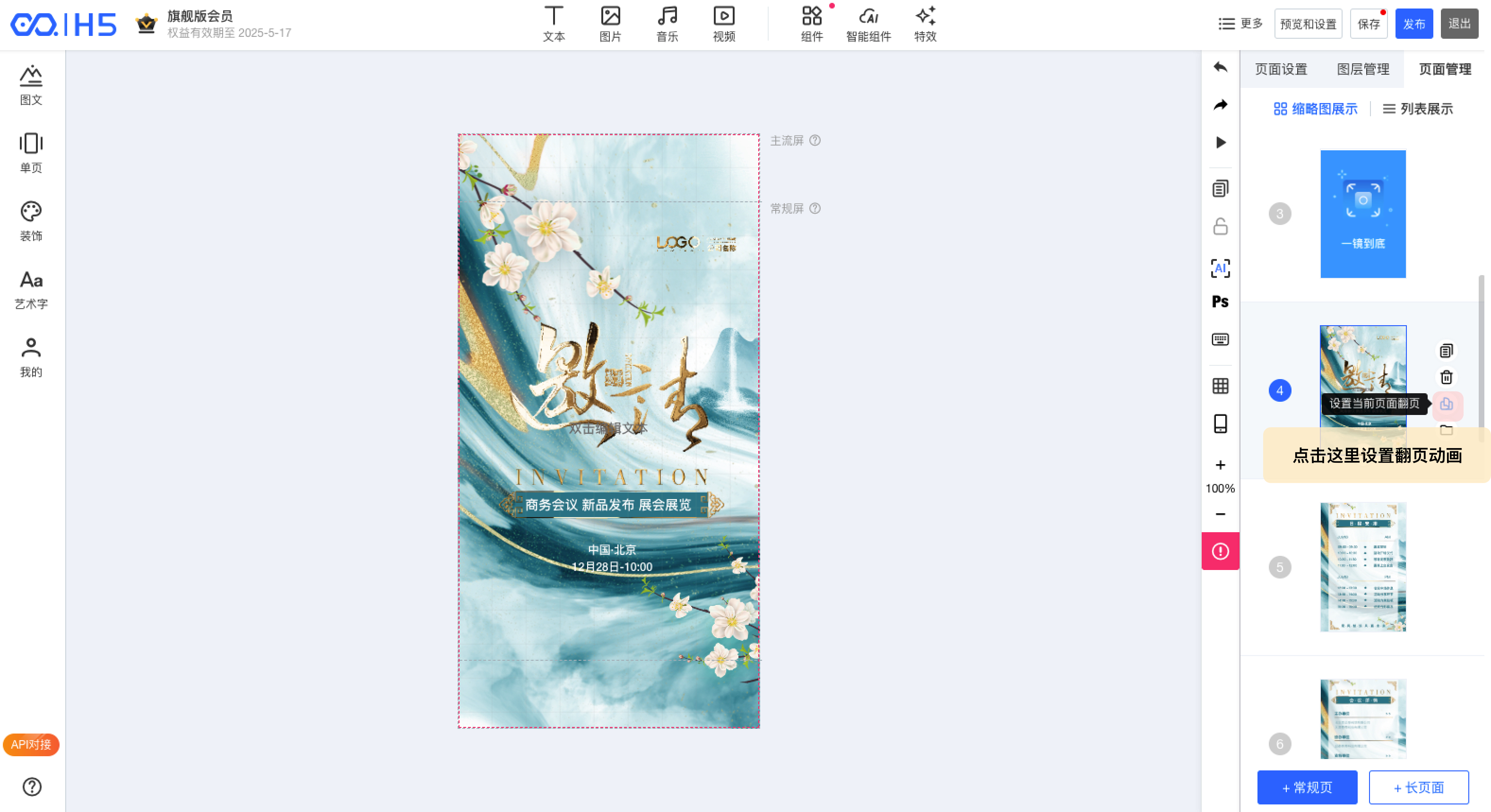 可以设置全部作品的翻页动画,也可以设置单页的翻页动画
