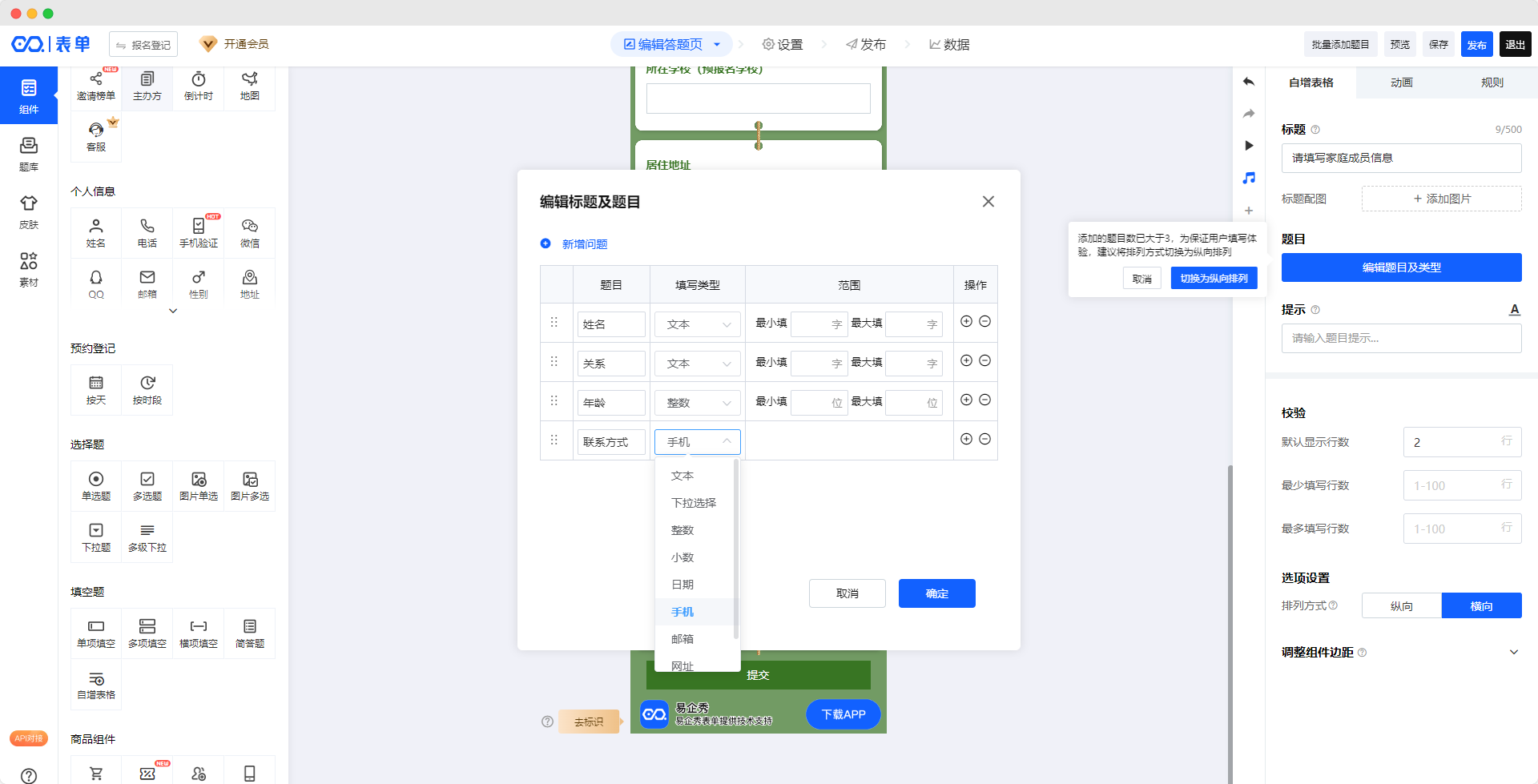 当自增表格的题目数量超过3个时,将会提醒转为纵向排列,目的在于减少横向滑动带来误操作关闭表单的可能,给填写者更好的体验。