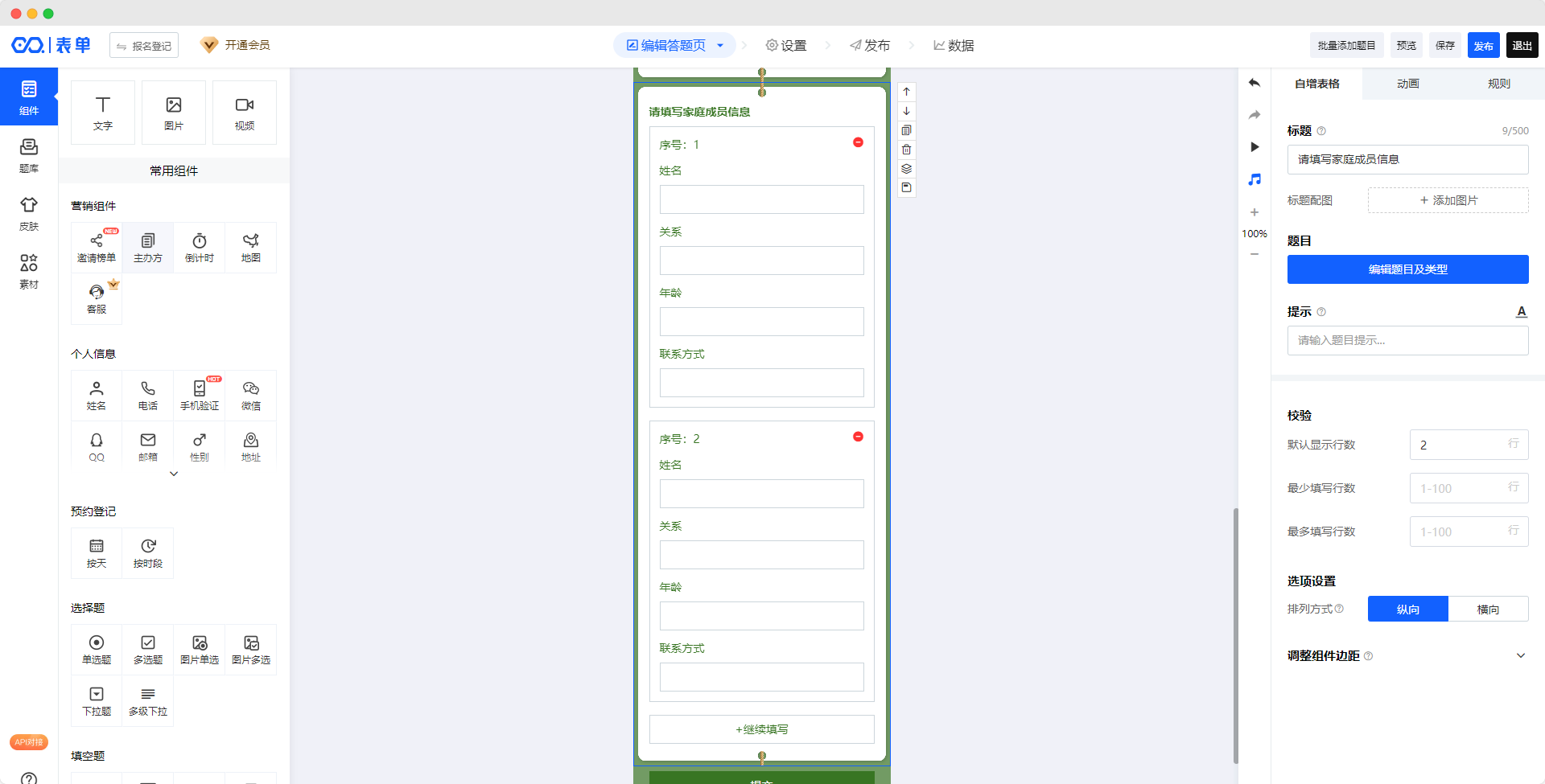 1、学校收集学生信息,填写家庭成员,固定收集内容有姓名、关系、年龄、联系方式,但不同家庭的成员数不同,就可以使用自增表格;