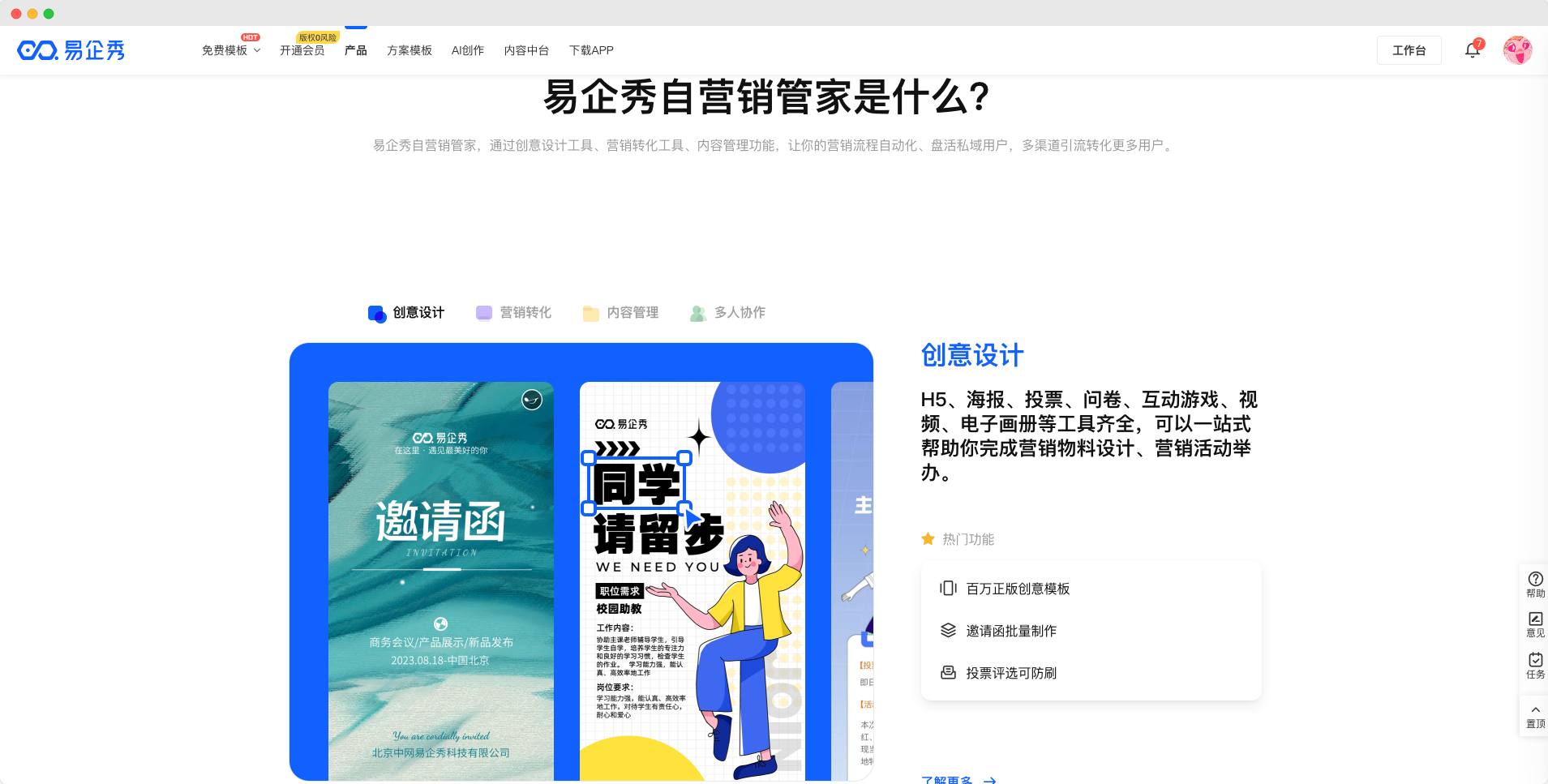 新增产品功能介绍,介绍页包含营销转化、团队协作、创意设计、内容管理内容,帮助您更全面了解易企秀。