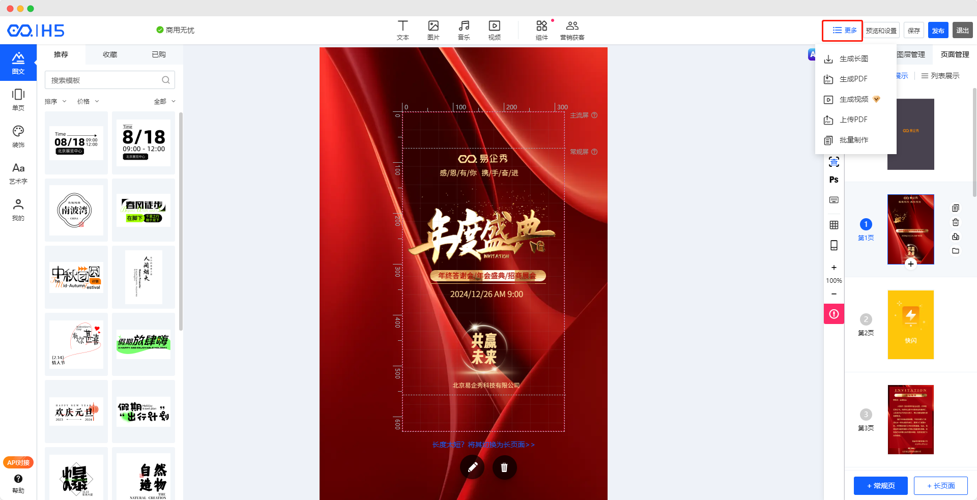 进入H5编辑器点击右上角“更多”,即可将当前作品“生成长图”、“生成PDF”、“生成视频”,以及可以通过上传已有PDF,将内容转换为H5在线传播。