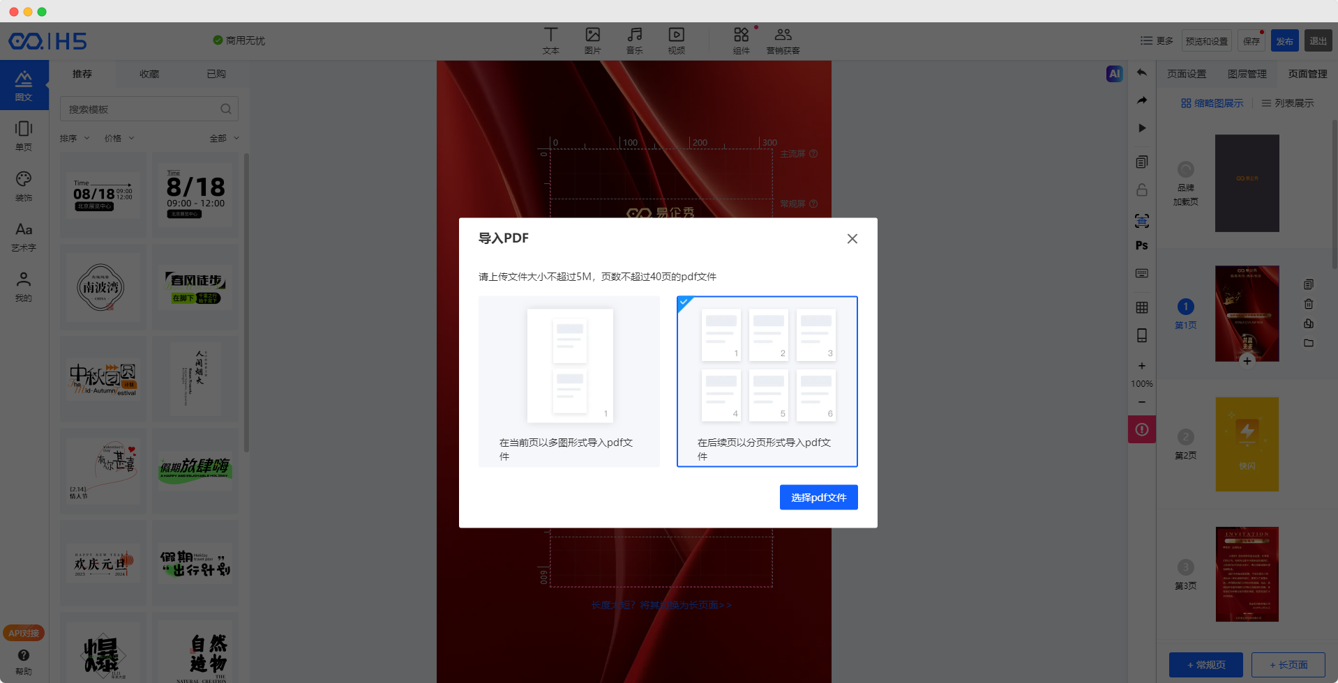 ③上传PDF,如下所示,可向当前H5作品中添加不超过40页的PDF文件,系统自动拆分PDF按页添加至H5中。