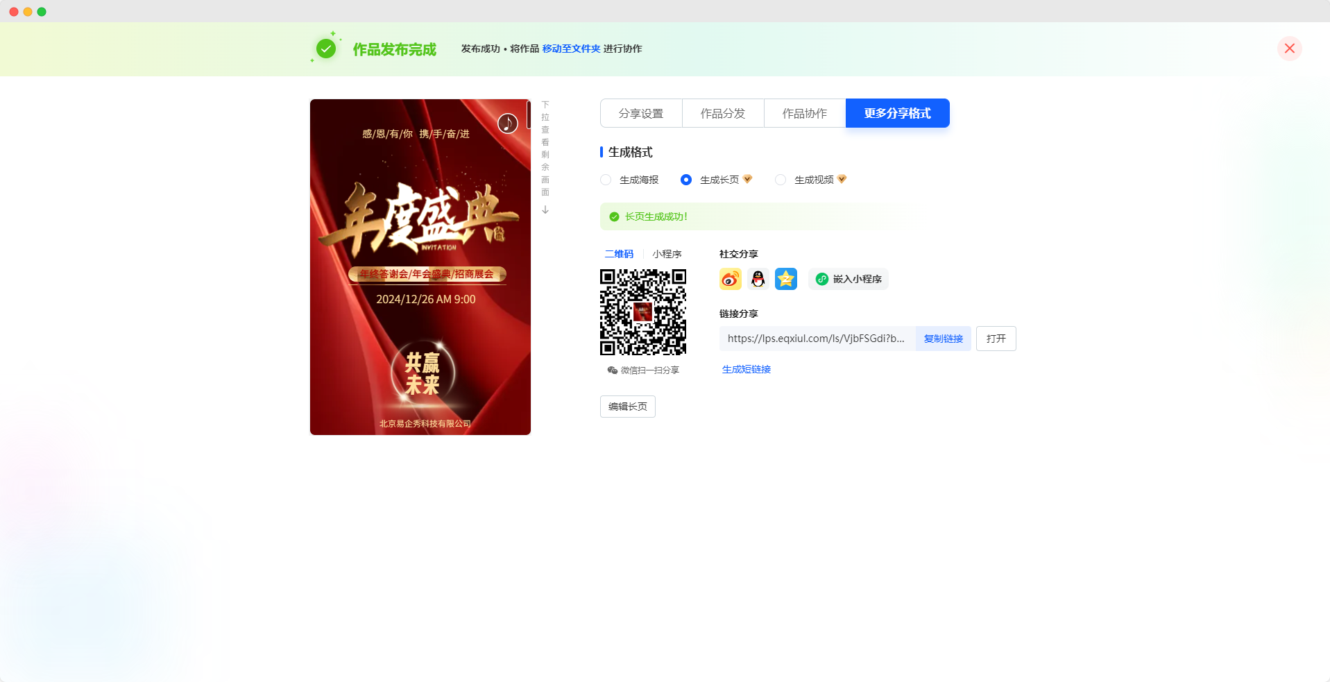④在发布预览H5时,也可以进行格式转换操作,如下图示,点击“更多分享格式”,即可进行生成长页和视频操作。转换生成的长页,还可点击“编辑长页”进入长页编辑器进行修改美化。
