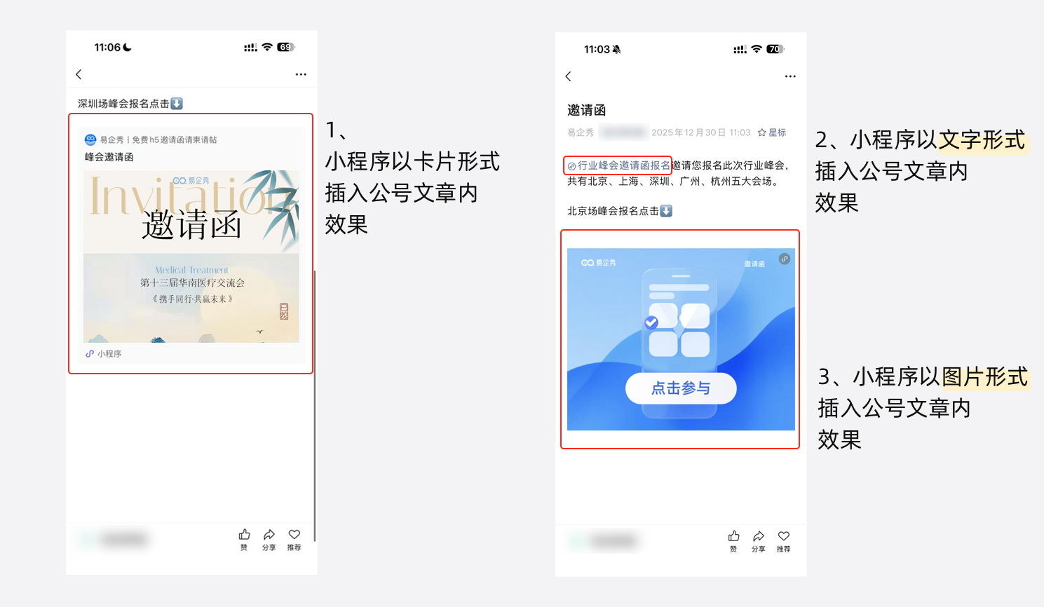 小程序能以卡片、文字、图片三种形式插入微信公众号推文中,点击可快速打开作品,极大地提高浏览体验,提高曝光率。