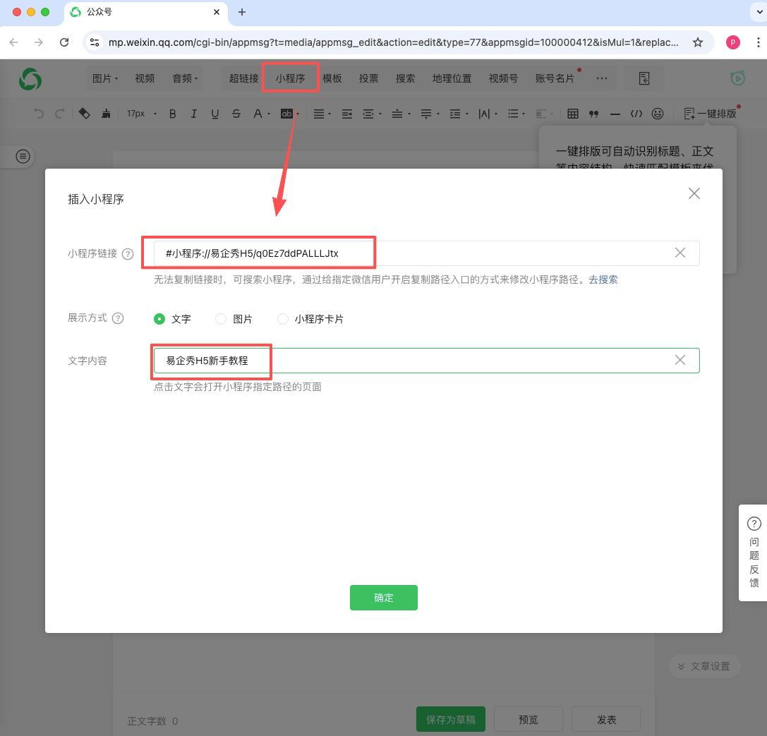 3、在公号文章编辑页面,点击顶部的小程序,粘贴小程序链接,展示方式选择文字,输入文字内容。