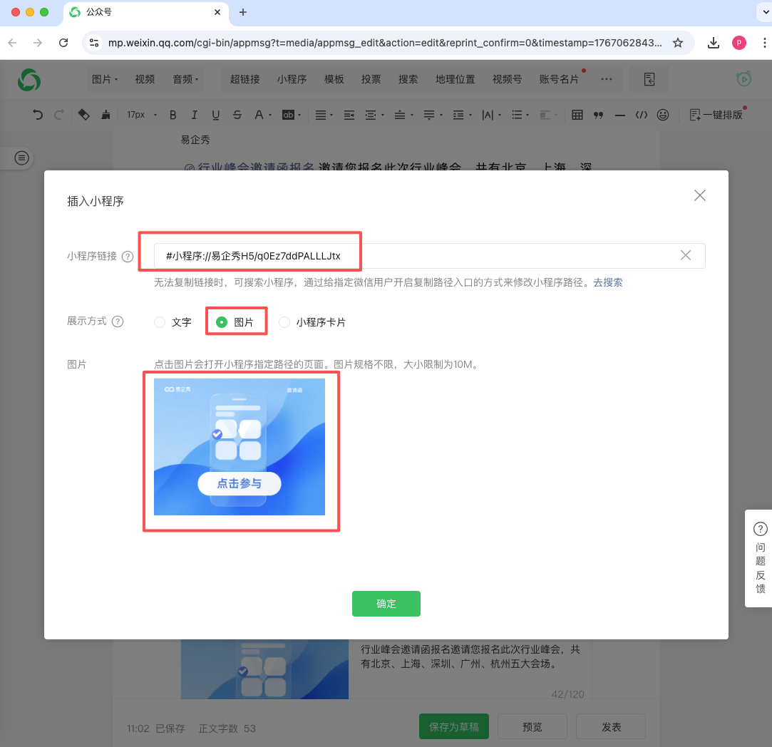 2、在公号文章编辑页面,点击顶部的小程序,粘贴小程序链接,展示方式选择图片,上传图片。