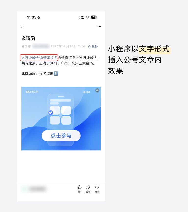 小程序以文字形式插入公众号文章预览效果: