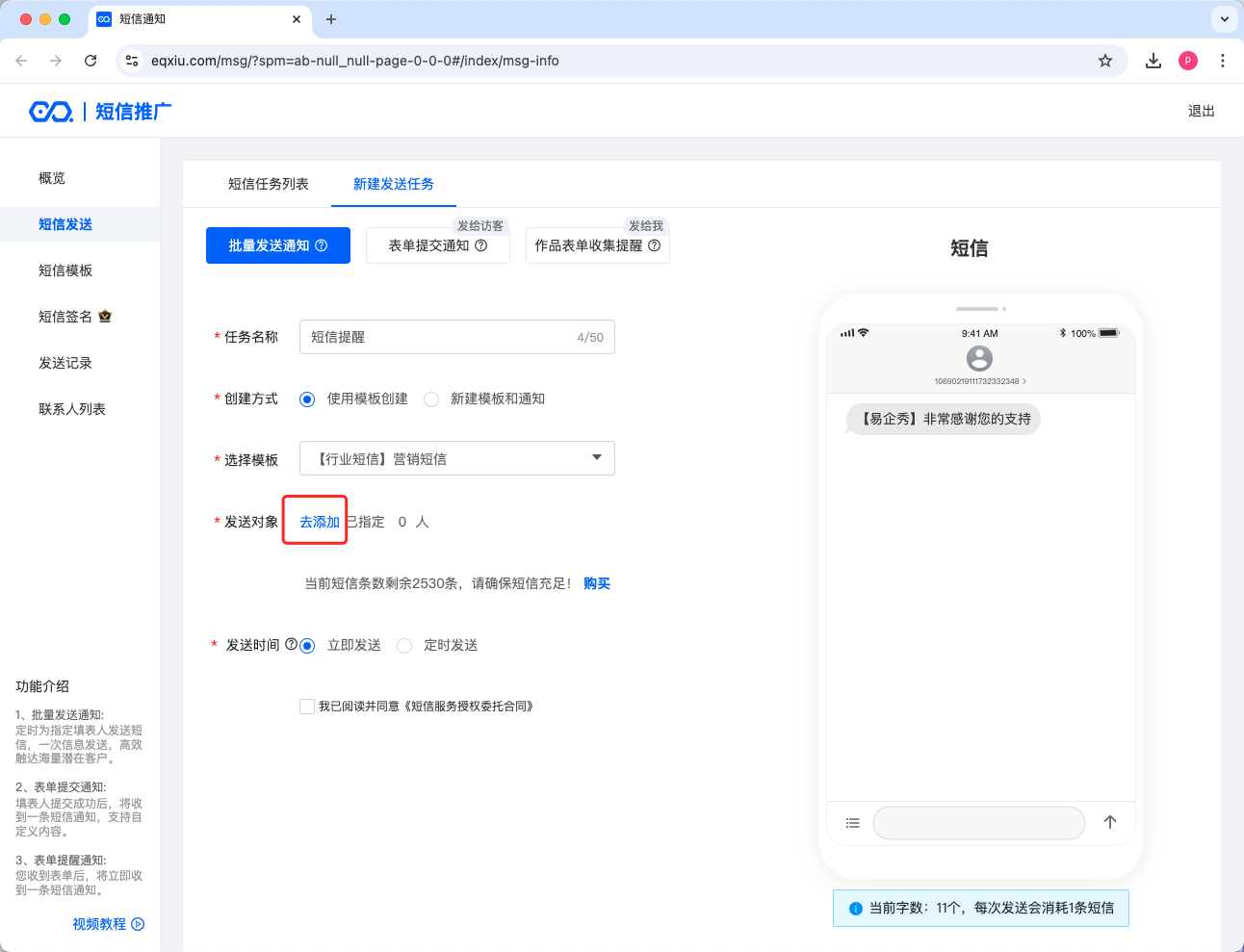 易企秀平台短信推广功能中的【批量发送通知】可批量发送营销短信