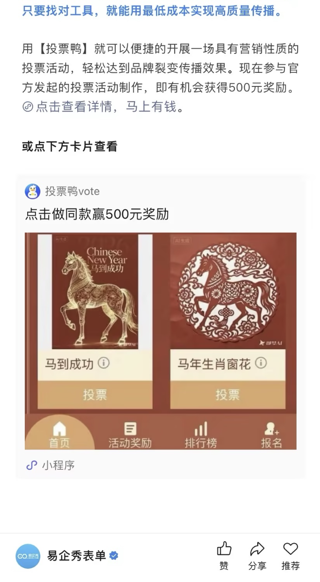 投票鸭(toupiaoya.com)制作的投票活动作品,可以便捷地以小程序形式嵌入到公众号中,充分应用公众号的能力,最大化为投票活动曝光,促进您的粉丝们参与。放入形式通常分为以下几种方式: