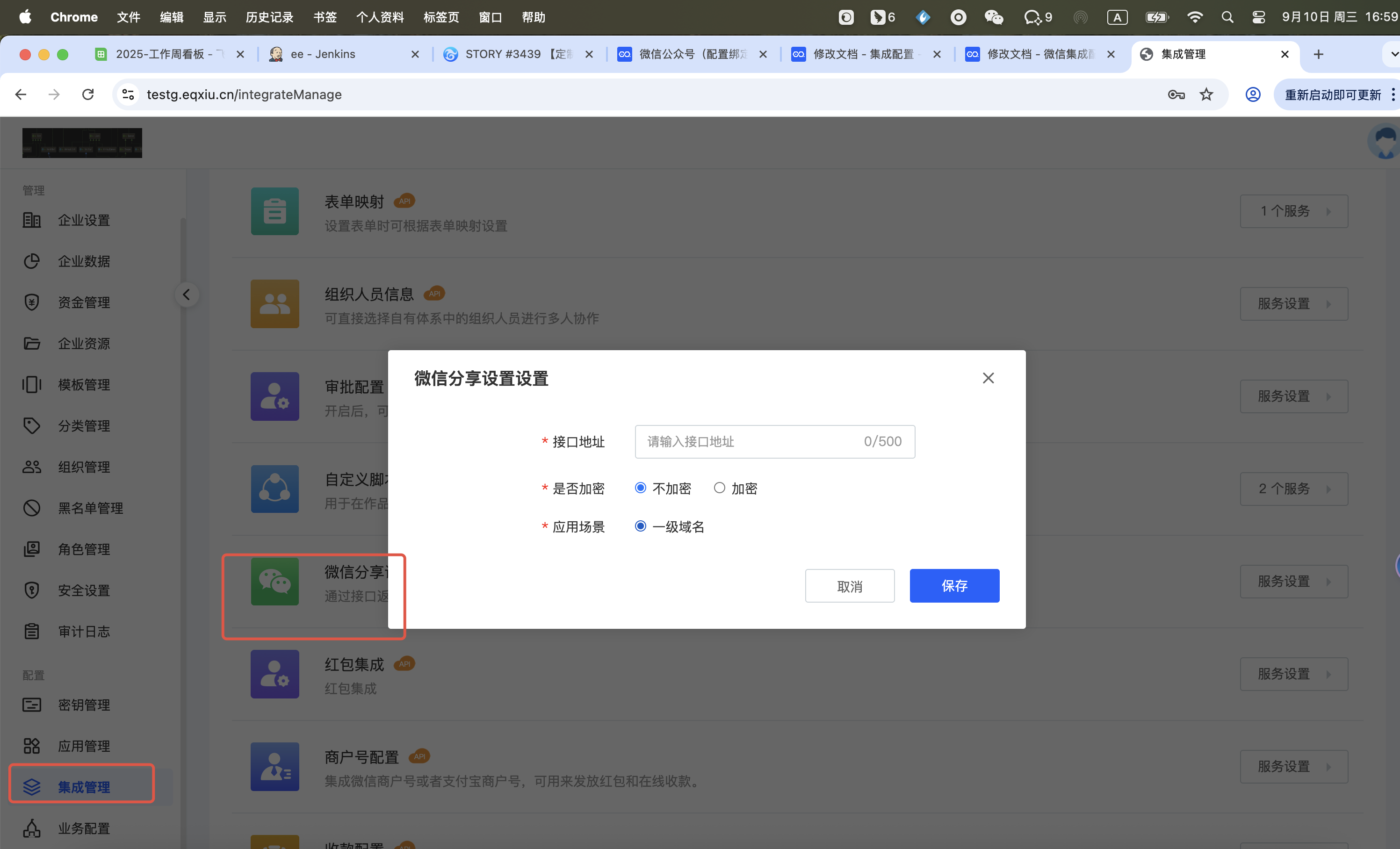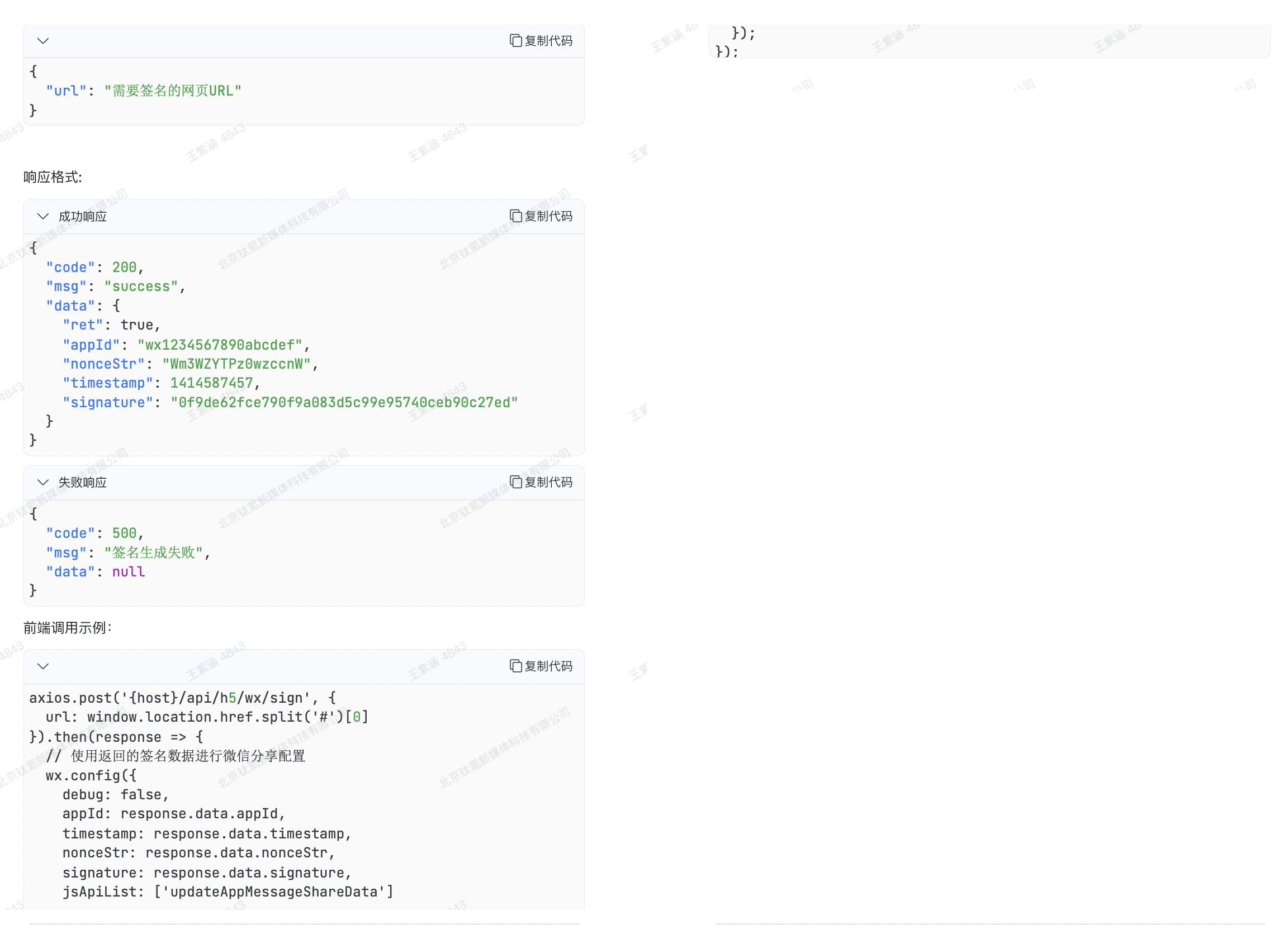 # 内容中台集成微信的配置有以下几种方式 ## 微信公众号(开放平台扫码绑定) ### 背景 内容中台注册微信开放平台服务商,公用号授权开放平台后,可以代公众号实现一部分功能。这种方式是内容中台默认推荐的方式,客户配置简单,只要管理员授权绑定即可。相关微信配置都在开放平台配置完成。同时不影响客户公众号信息可以独立再授权给其他开放平台和自研开发 ### 适用场景 - 微信授权 - 强制关注 - 微信分享 ### 使用前置条件 2025-03月后 网页服务 权限成为互斥权限。导致该权限只能授权给一个开放平台。 - 未授权给其他开放平台 - 小程序内使用此种公众号授权,需要增加白名单域名$APPID.eqxiu.cn,其中$APPID为公众号的实际app ID。 - 活动链接域名是eqxiu.cn结尾域名,使用一级域名的客户无法使用 ### 配置说明 > 集成管理功能使用说明 - 企业配置入口:控制台-> 集成管理 - 平台配置入口:控制台-> 开放管理-> 配置 -> 集成配置 > 通过绑定微信公众号,可以实现一键发布作品,并可以在微信中传播作品时获取访客信息。 1. 找到配置项后点击面板中的“微信公众号”的“添加”按钮或点击“服务设置”下的“添加新的微信公众号”,随即打开微信公众号绑定页面”的设置、查看按钮,即可进入模态框  2. 打开腾讯微信公众号授权页面,进行扫码授权  3. 授权成功后,返回内容中台页面,点击“已完成绑定”按钮.如遇到问题可点击“绑定遇到问题”查看详细步骤  ## 微信公众号(配置绑定) ### 背景 2025-03月后 网页服务 权限成为互斥权限。导致该权限只能授权给一个开放平台。有些企业已经授权绑定了其他开放平台,此时无法绑定内容中台开放平台。为了减少客户的开发(实际客户可以采用自定义授权对接),内容中台支持将用户的app ID,secret 等公众号信息配置到内容中台使用。 ### 适用场景 - 微信授权 - 强制关注 - 微信分享 备注:因为此种方式是客户的配置,一级域名使用此种配置也支持以上微信能力 ### 使用前置条件 - appid secret 信息在其他系统没有使用 - 公众号配置域名对应的白名单 - IP白名单增加内容中台的出网IP地址 ### 配置说明 [微信公众号配置绑定产品配置说明](https://hc.eqxiu.cn/doc/3761/ "微信公众号配置绑定产品配置说明") ## 微信分享设置 ### 背景 部分用户采用非eqxiu.cn传播,此方式内容中台称为一级域名。因为此时域名非内容中台归属,所以会导致内容中台的微信分享无法唤起卡片分享。另外客户也无法将appid,secret相关信息配置到内容开放平台。因此出现此种方案。客户可以出对应接口,通过接口将微信公众号的能力共享给内容中台 ### 适用场景 - 微信分享 ### 使用前置条件 - 配置了一级域名 - appid secret 已经在使用,无法配置到内容中台 ### 配置说明 #### 入口  备注:根据是否加密,接口的入参会有变化 #### 接口规范 - 微信签名接口 - 方法类型:POST - Content-Type:application/json - 接口入参【不加密】 | 参数名 | 是否必须 | 参数类型 | 参数说明 | | --- | --- | --- | --- | |url|是|String|微信签名的url| - 接口入参【加密】 | 参数名 | 是否必须 | 参数类型 | 参数说明 | | --- | --- | --- | --- | | nonce | 是 | String | 随机字符串 | | timestamp | 是 | Long | 当前 UNIX 时间戳,可记录发起 API 请求的时间。例如1529223702 | | signature | 是 | String | 请求签名。 | | msgEncrypt | 是 | String | 数据明细,不同业务类型,数据格式不一样 | - msgEncrypt解密数据格式 | 参数名 | 是否必须 | 参数类型 | 参数说明 | | --- | --- | --- | --- | |url|是|String|微信签名的url| - 接口返回值 | 参数名 | 是否必须 | 参数类型 | 参数说明 | | --- | --- | --- | --- | |code|是|String|状态码,200请求正确,其他视为失败| |msg|否|String|返回消息| |data|是|Object|微信签名信息| 至少包含code和msg参数。 - 接口data具体信息 | 参数名 | 是否必须 | 参数类型 | 参数说明 | | --- | --- | --- | --- | |appId|是|String|对应的公众号appid| |nonceStr|是|String|用于url签名的随机字符串| |timestamp|是|int|用于url签名的时间戳| |signature|是|String|微信签名结果| 返回值示例