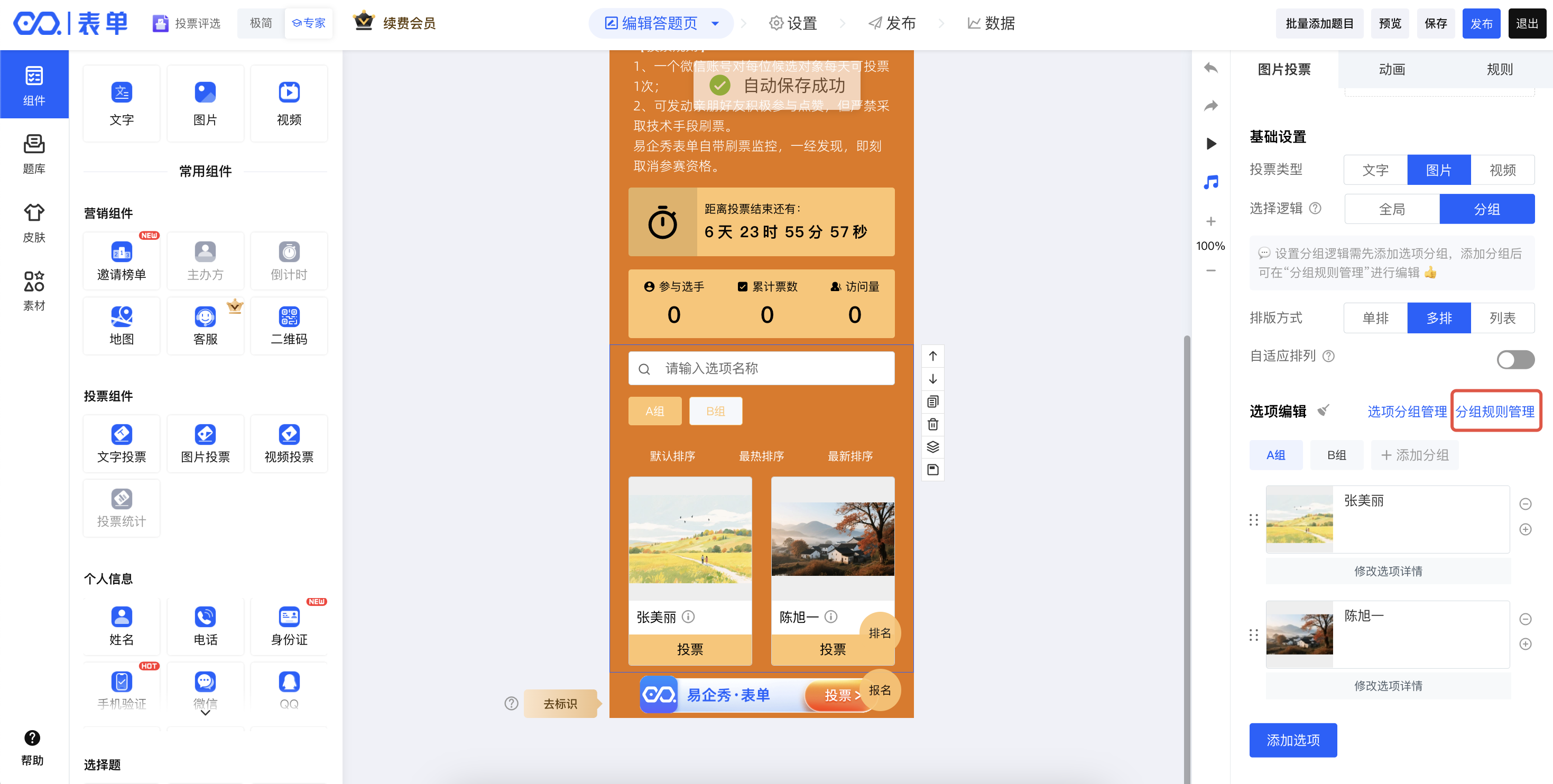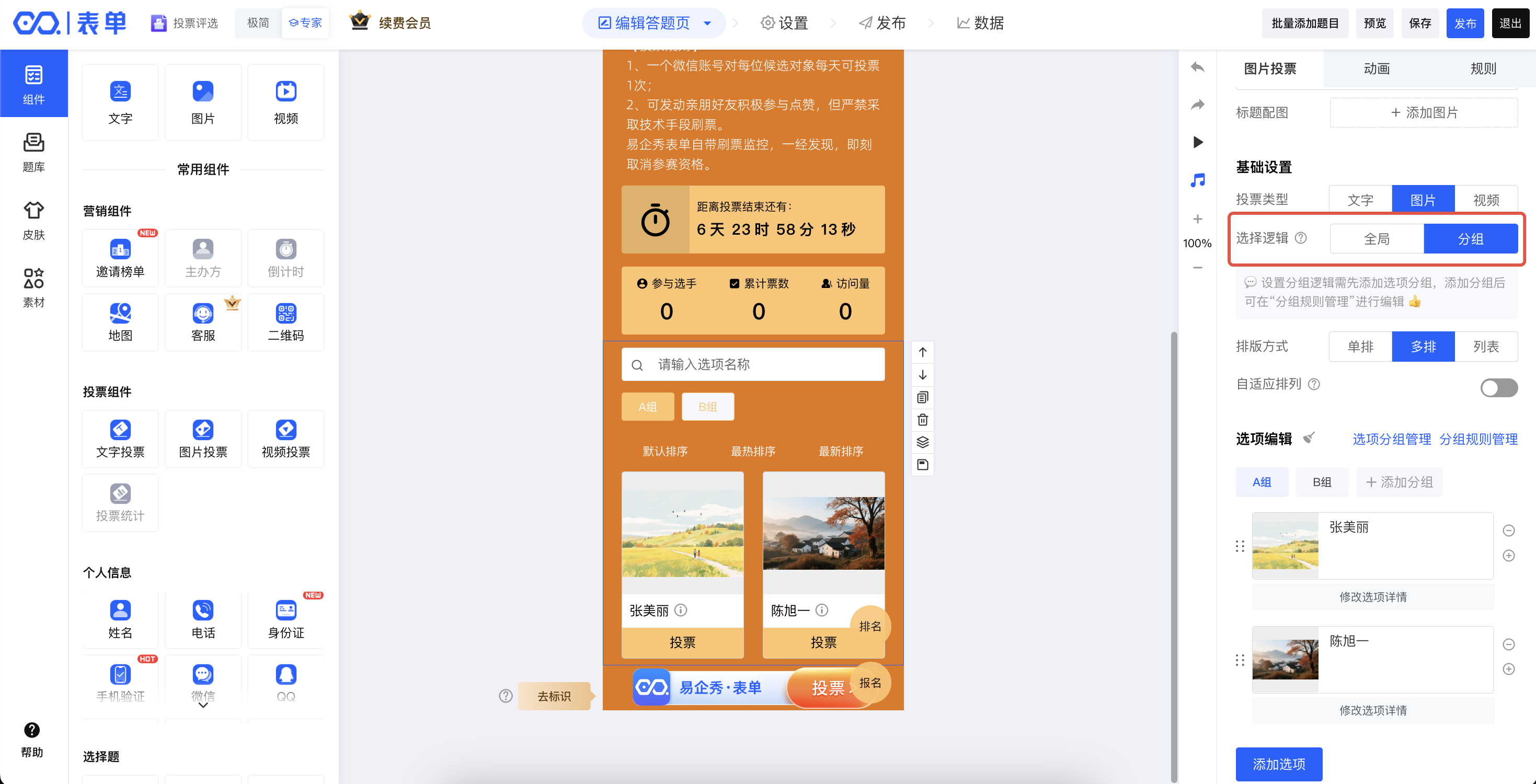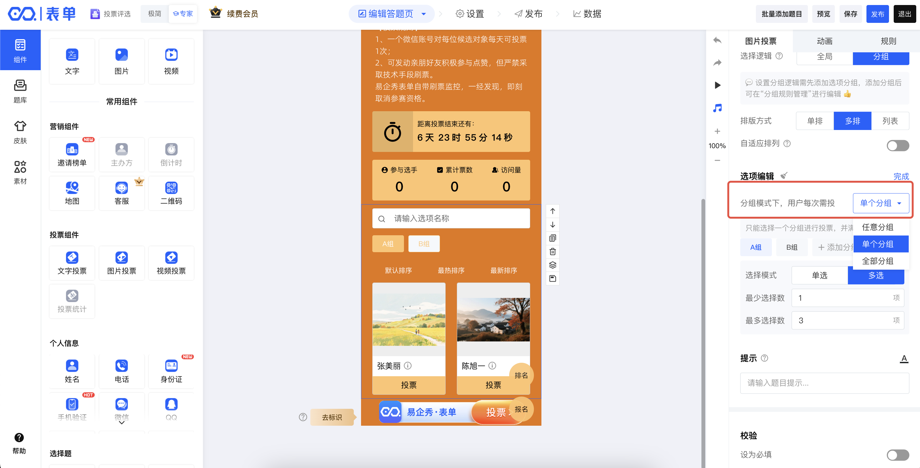 在易企秀表单中,提供两种交互编辑方式:“专家模式”、“极简模式”,主要为交互不同,但功能相同,以下主要在“专家模式”下介绍如何设置分组投票规则。极简模式下,分组投票设置操作教程,点击查看>>