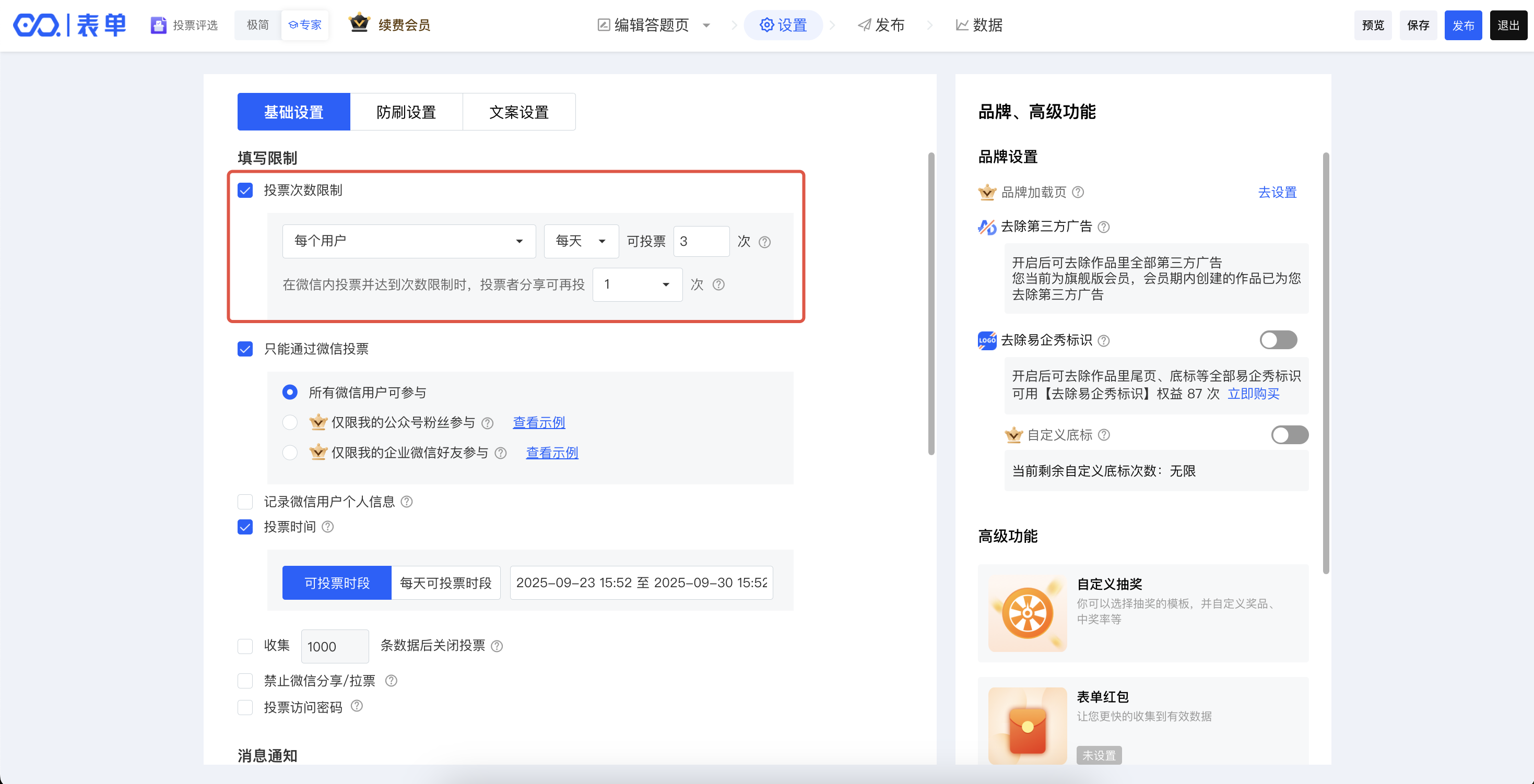 进入“设置”,在“基础设置”中,设置“投票次数限制”。