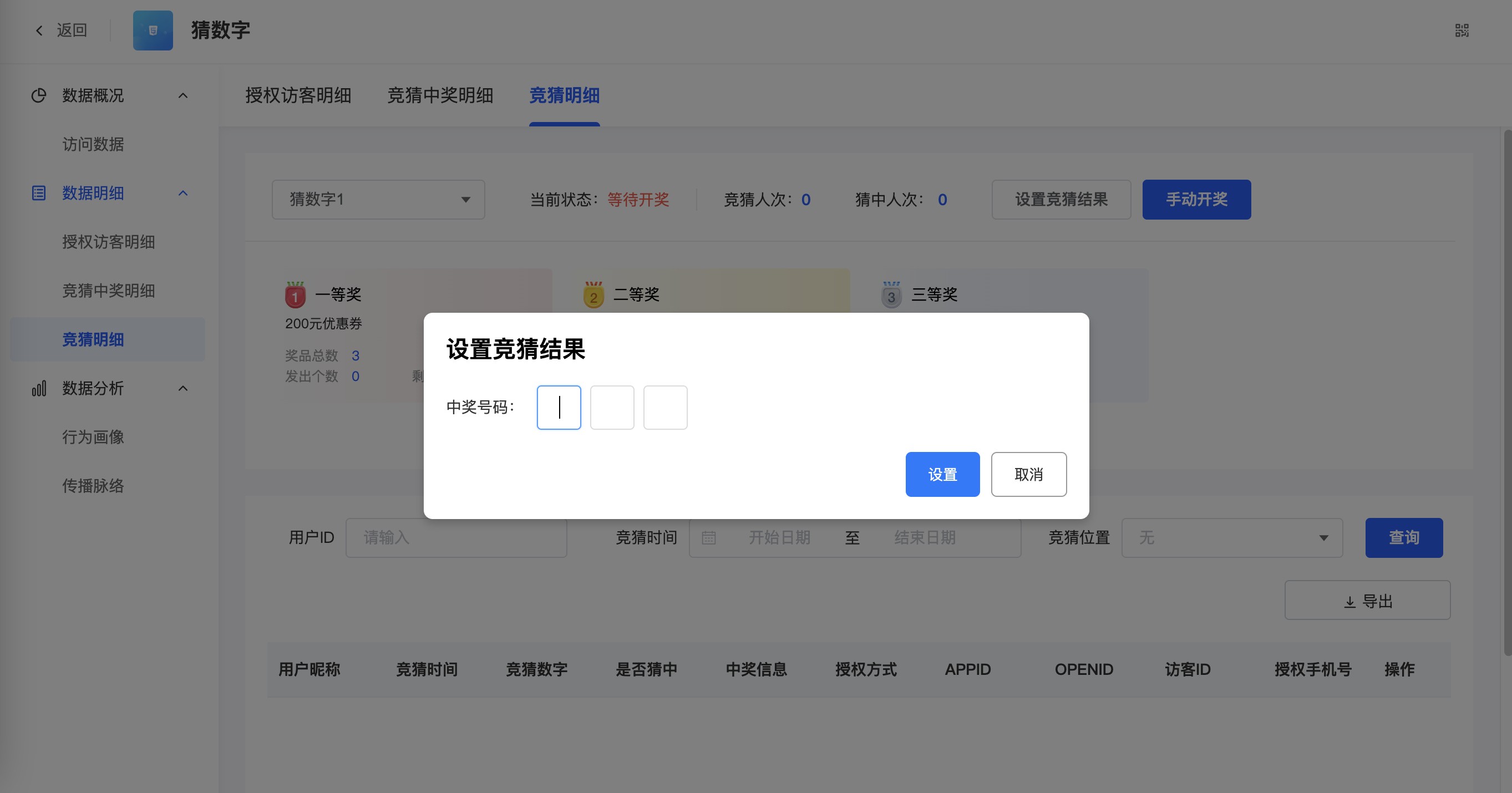 猜数字玩法类似于选择彩票数字,输入一些数字,开奖之后,猜中会获得奖励,需要等真实比赛结束后,也是需要等开奖时间到了,点击活动管理-竞猜明细-设置竞猜结果,并且手动开奖