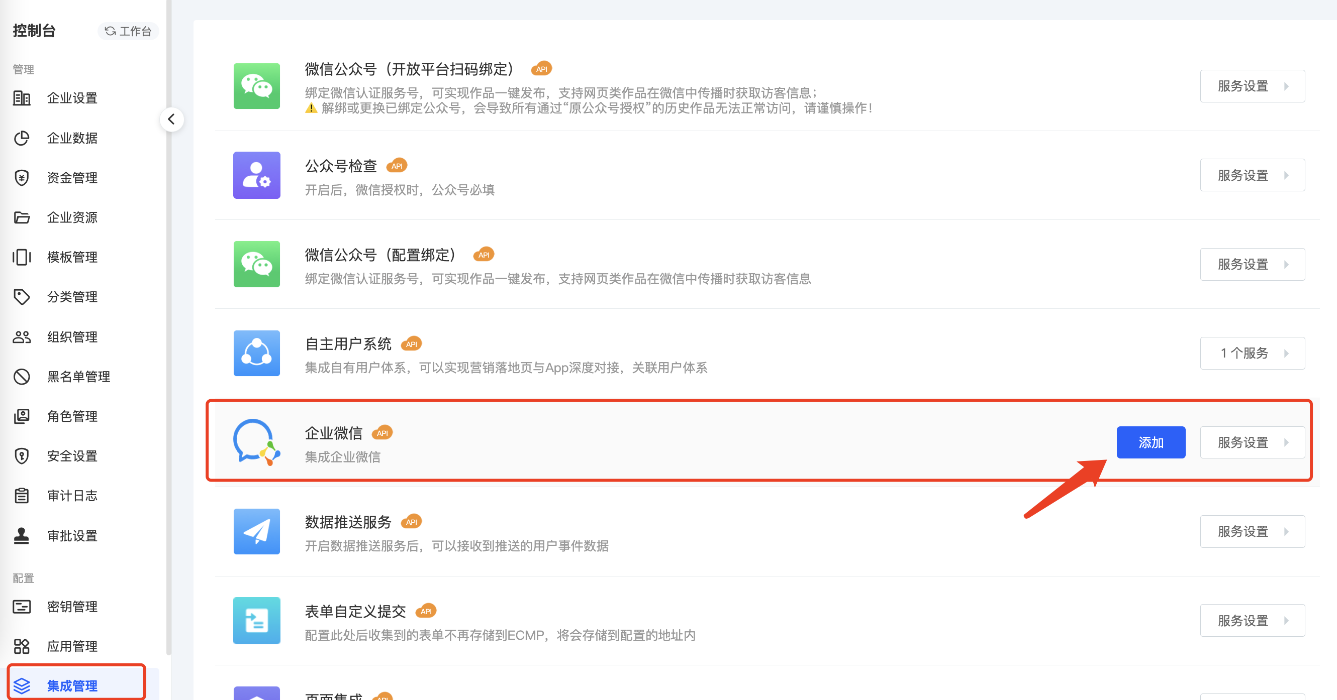 1.集成管理-企业微信-点击添加