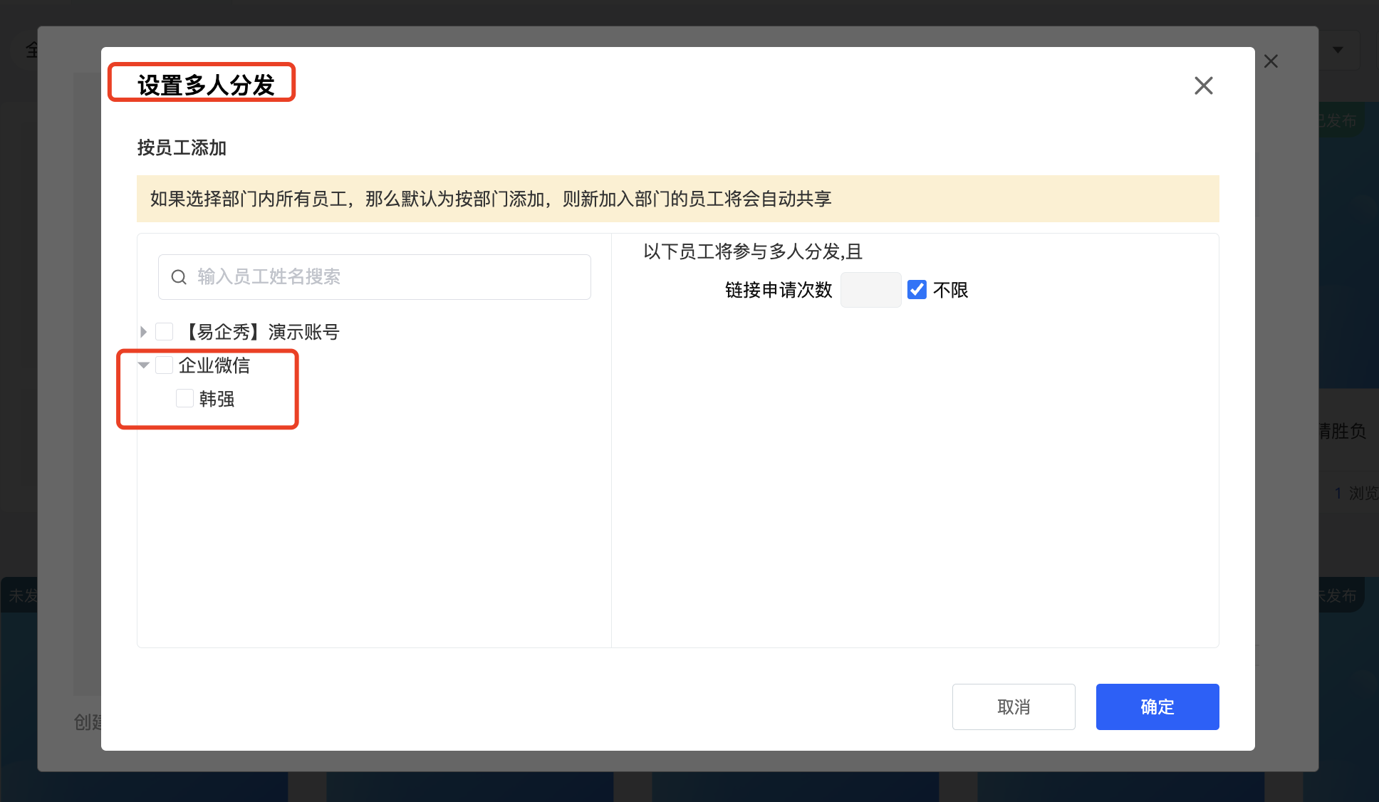 作品分发时,可以直接选择企业微信的员工进行分发