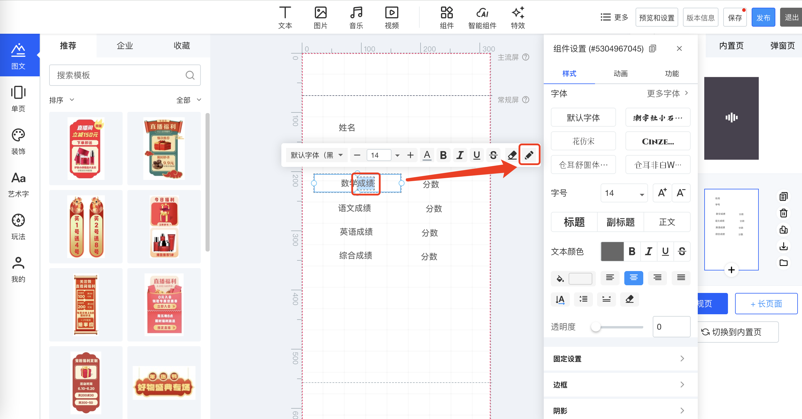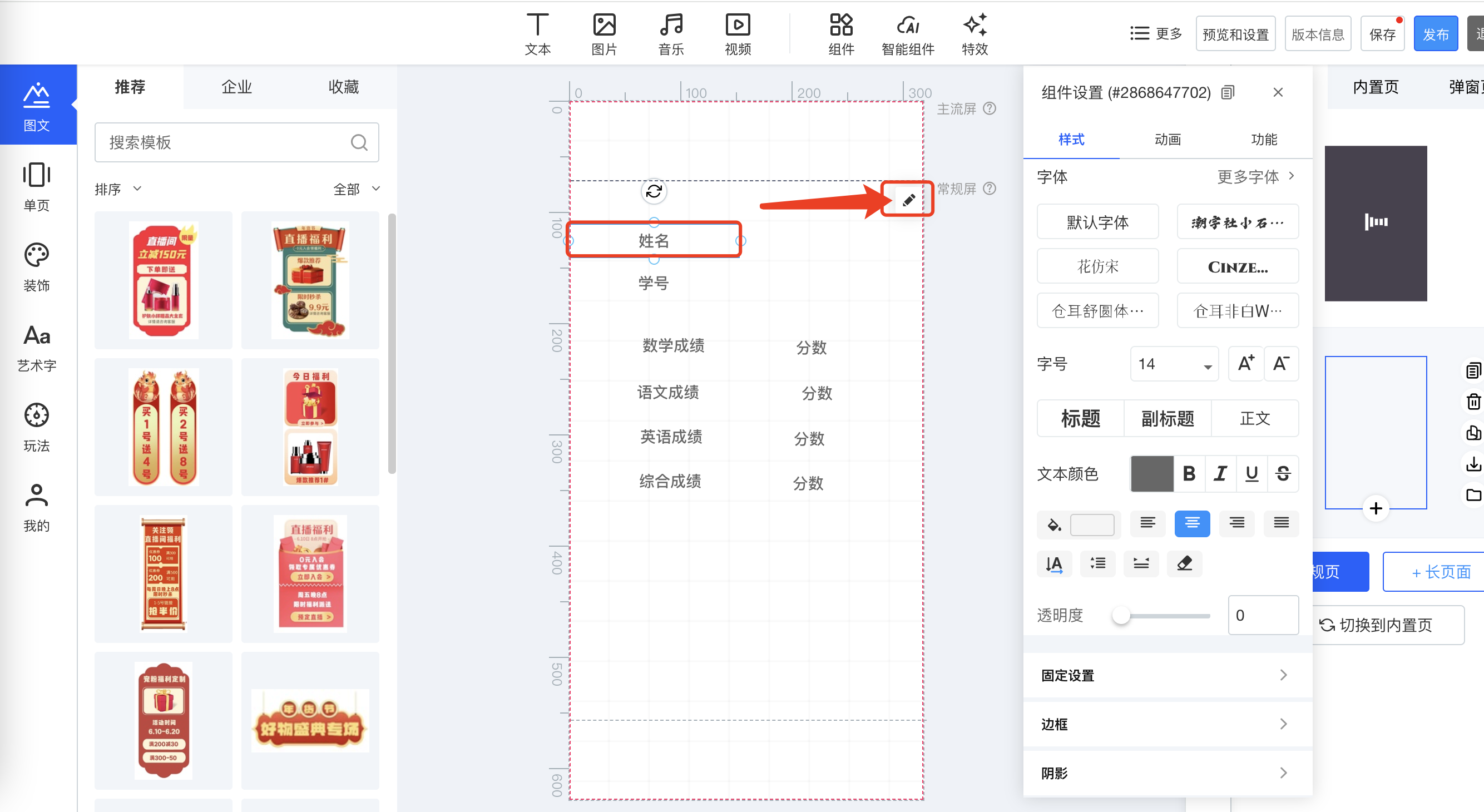 ③.点击需要动态渲染的组件,如姓名,点击右上角修改icon。
