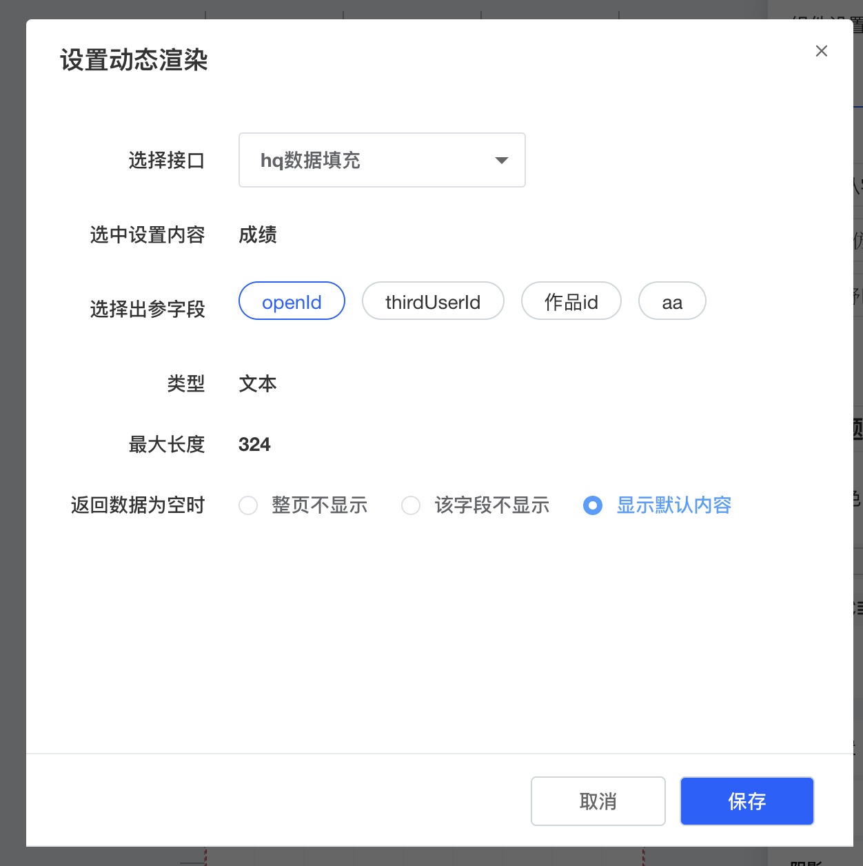 ④.会弹出设置动态渲染的弹框,选择该字段使用的数据来源接口,选择之后,可以看到该接口相关的「出参字段」,选中即可。