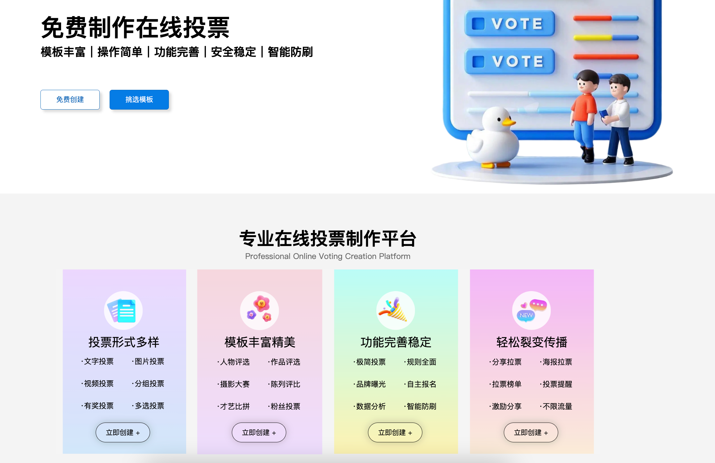 投票鸭作为易企秀旗下单独拆分的投票工具产品,核心优势在于完全免费无限制 + 易企秀生态协同 + 支撑千万级访问 + 海量正版模板 + 智能防刷 + 全链路数据闭环。