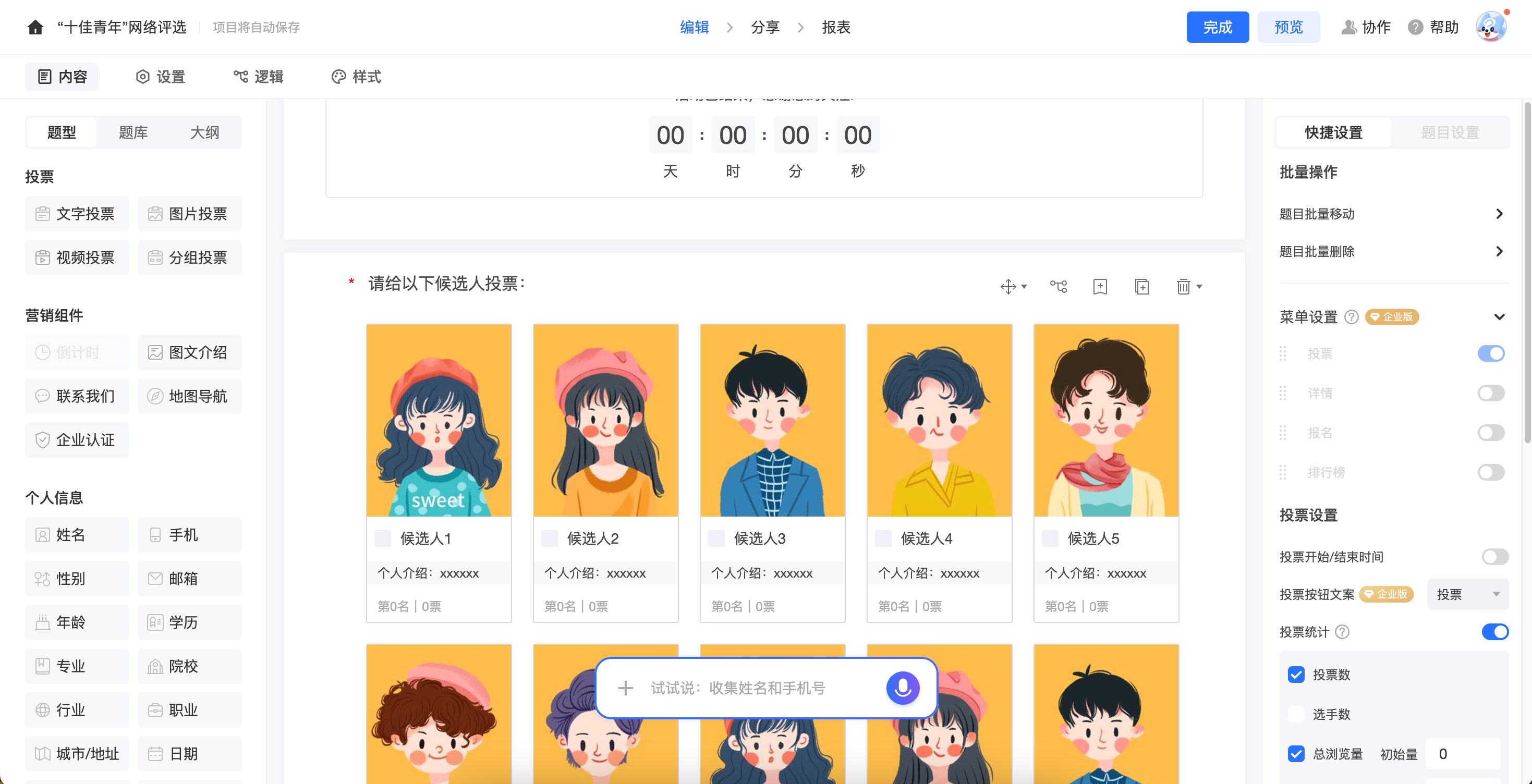 内部的投票,只需要简单完成制作即可,外部的投票则是需作为一场营销活动来策划、执行,所以此类投票活动,通过使用一个好的投票制作工具,能很好的起到事半功倍的效果。