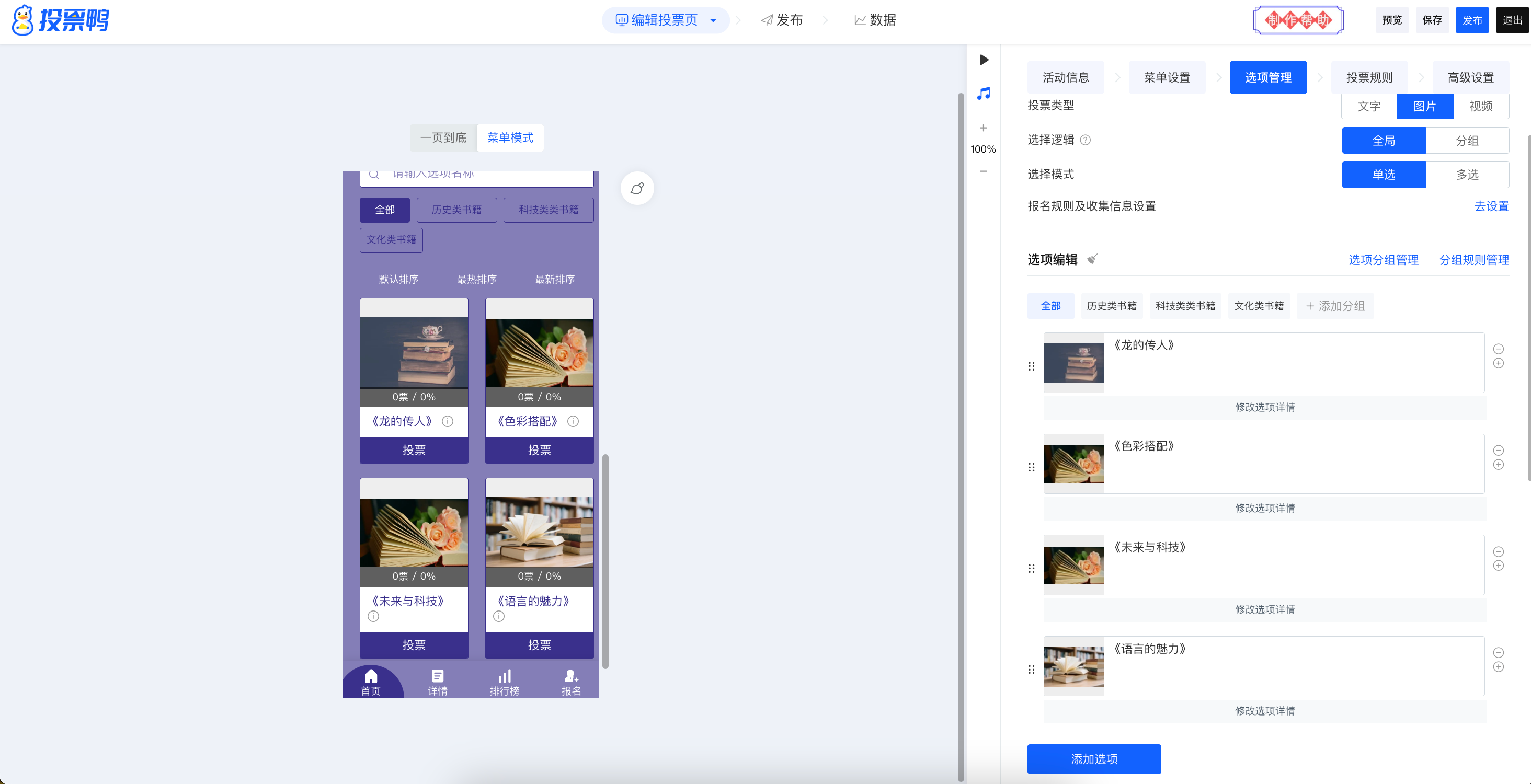上述设置完毕点击保存发布此时完成投票活动制作另外页面添加选手完成制作