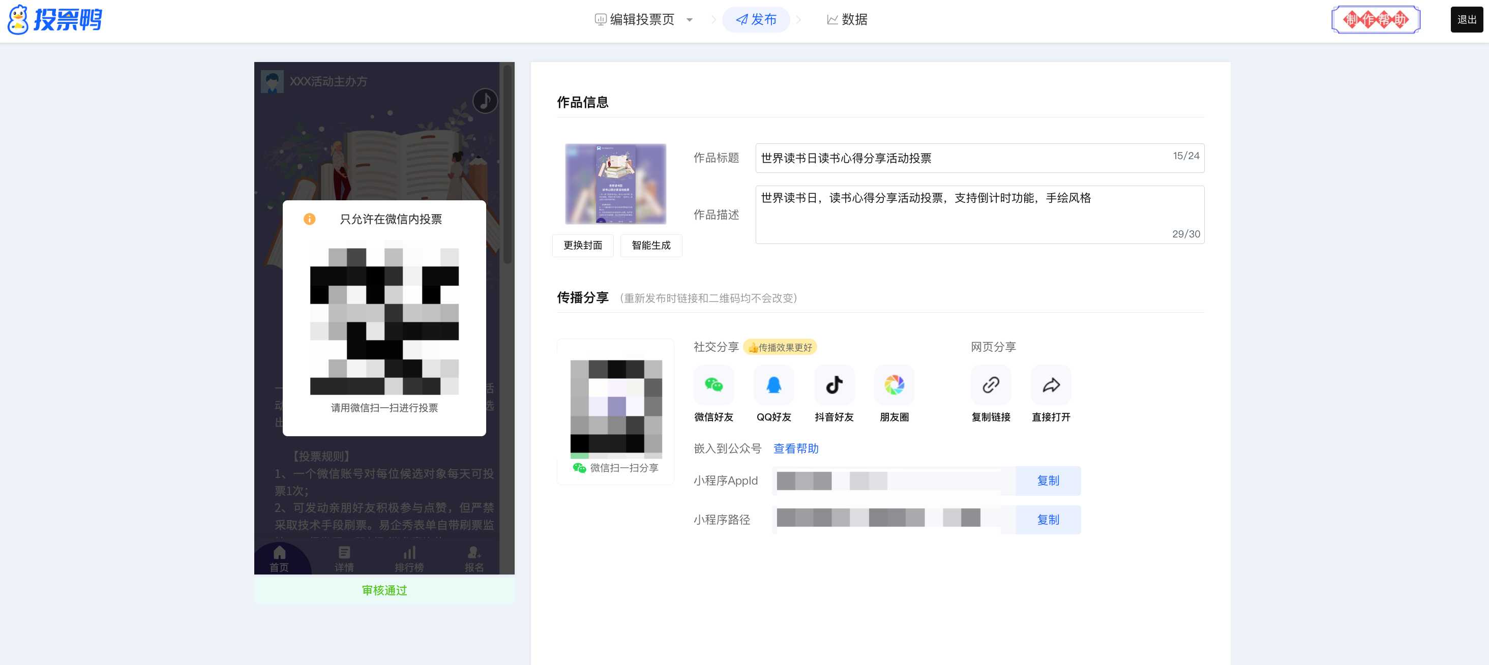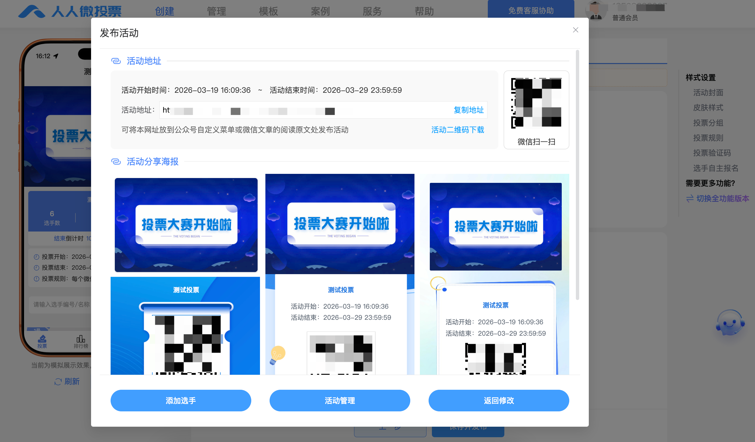 一场投票活动的制作,简单仅需上述三个地方设置完可以点击发布即可拿到投票活动二维码分享出去