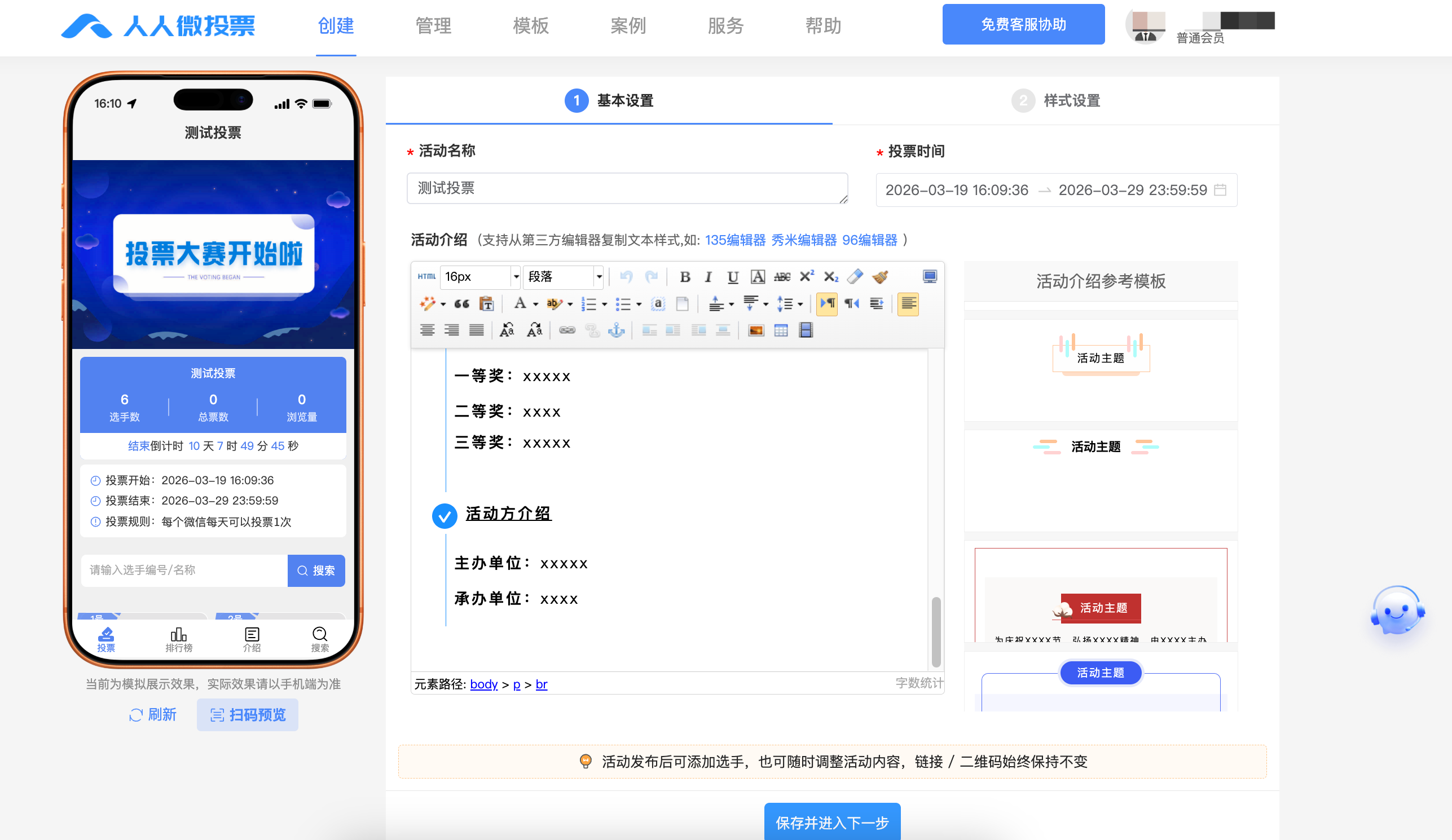 通过模板创建投票只需修改其中介绍文案添加选手文字图片视频设置投票规则即可