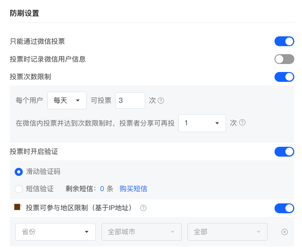 开启短信验证,投票时需输入手机号接收并填入短信验证码,以此保证参与投票的人至少有真实的手机号,防刷能力最强;