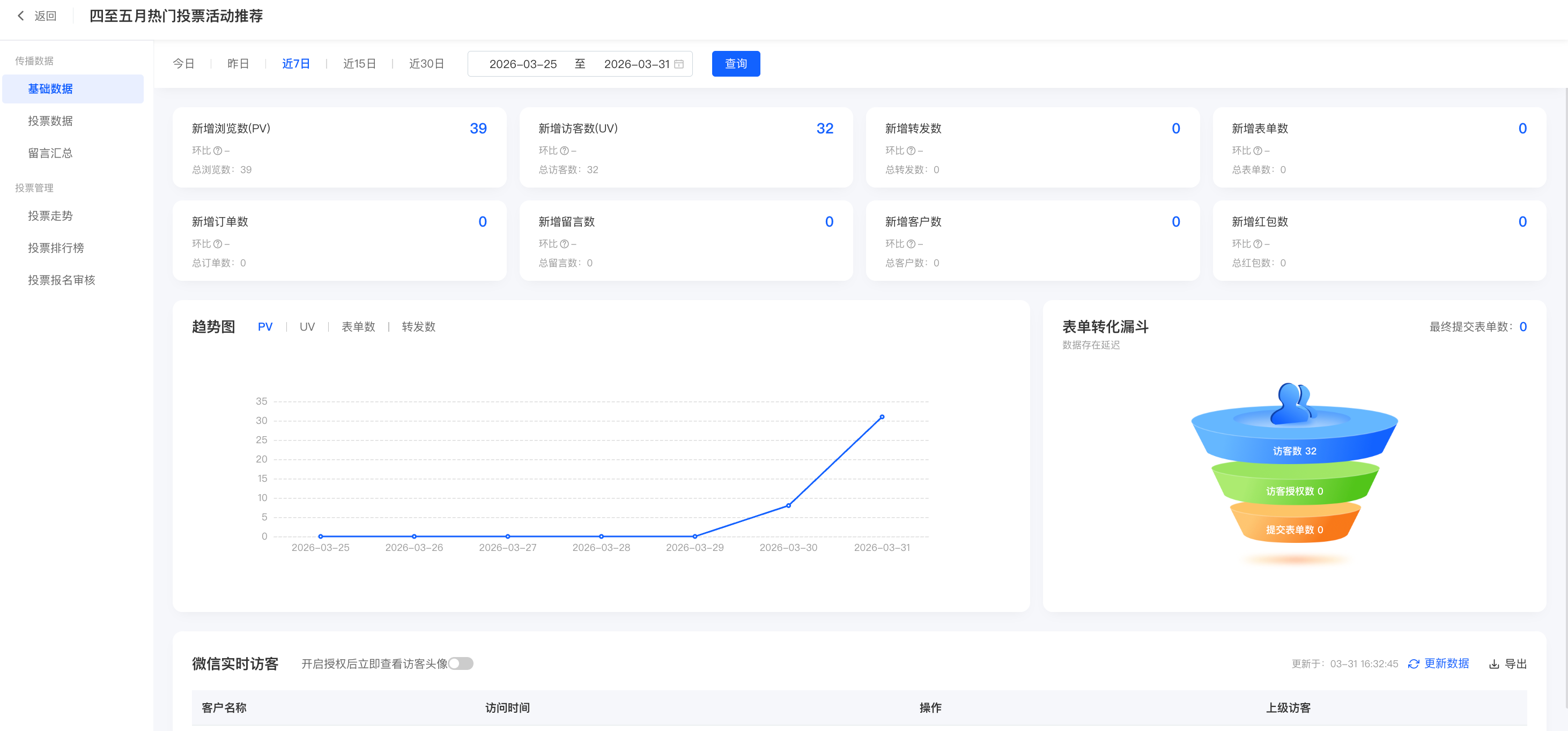 活动进行中,在后台可以看到整体的活动访问、票数明细、投票走势等。可用于后续进行活动复盘时,得出活动的曝光、参与等率值数据。