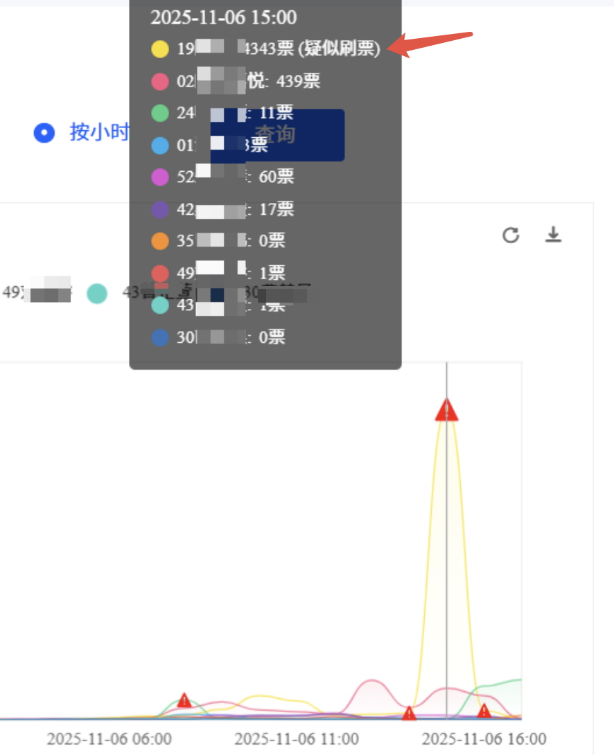 这期间,难以避免有的选手会出现刷票的情况,咱们就可以通过“投票走势”功能再结合“投票数据”中所记录的投票人的IP地址和投票时长,综合进行判断,并对刷票行为进行处理。