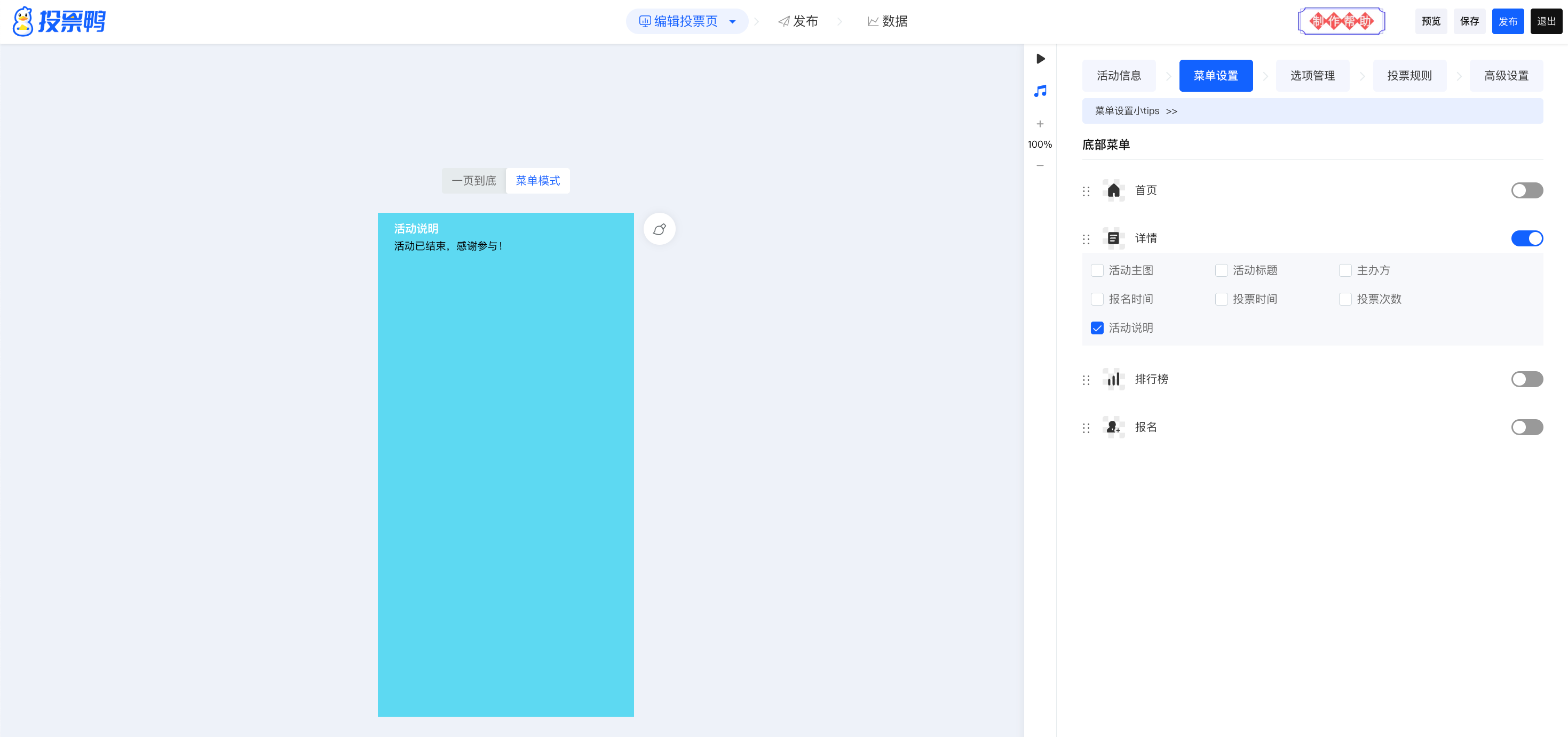 若在活动结束后,不想别人再看到活动内容,可以将内容进行隐藏。在投票鸭的菜单模式下,关闭其它内容页面的显示,仅保留活动详情页中的活动说明内容,再把活动说明改为任意提醒文字就行。这样别人看不到内容,而活动的数据仍会保存在后台。